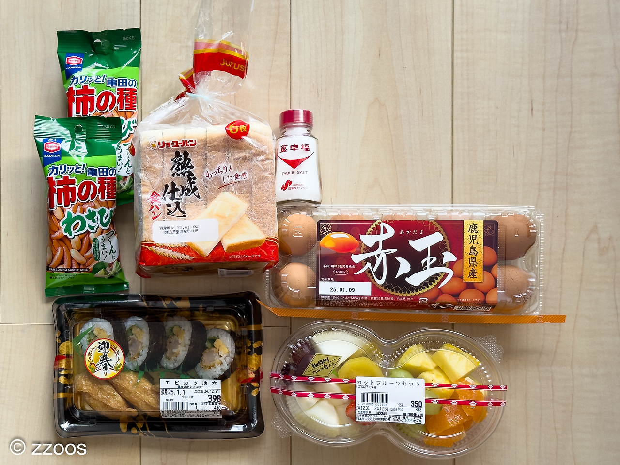 그리고 이와사키 슈퍼에서 식빵과 소금, 계란 그리고 과일 모둠을 샀네요.