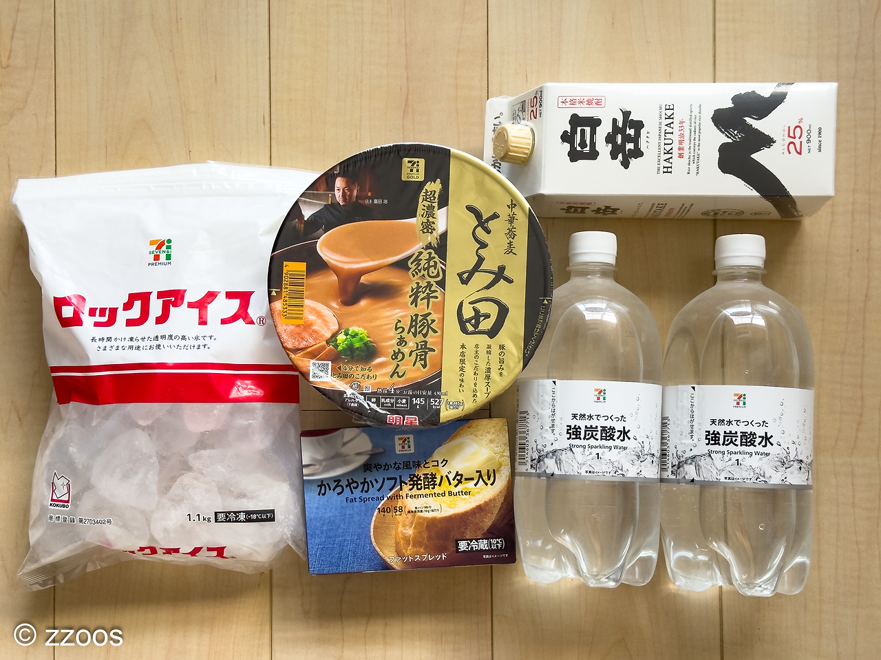 프렌치토스트를 만들어 먹기 위해 버터가 필요했지만 이상하게도 슈퍼에 버터가 안 보여서 결국 편의점에 들러 버터를 사면서 얼음, 고메 쇼츄(쌀 소주), 탄산수를 함께 샀습니다. 집에서 소다와리 한 잔씩 만들어 마시려면 일단 술과 탄산수 그리고 얼음이 있어야 하니까요.