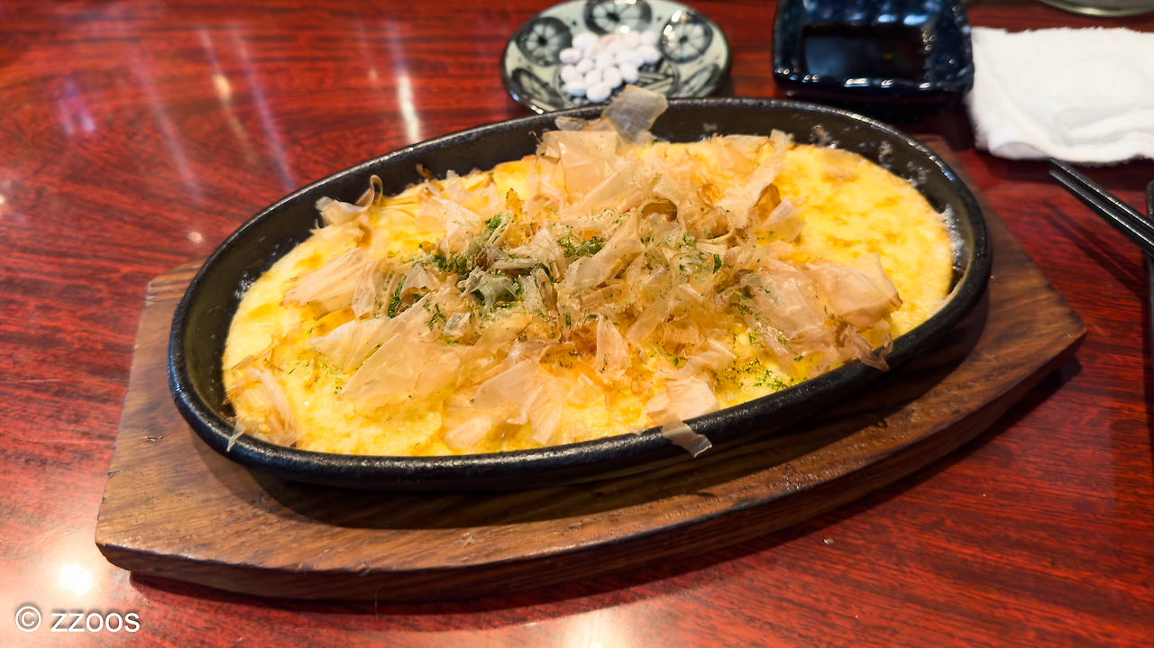제 생각엔 그냥 산마를 두껍게 잘라서 그대로 불에 구운, 그런 단순한 걸 생각했는데 막상 나온 음식은 예상과 전혀 다른 것이었습니다. 산마를 갈아서 계란과 육수를 섞은 다음 철판에 올려 그대로 구운 것 같아 보였어요. 그 위에 가츠오부시를 잔뜩 뿌려 주셨고요.