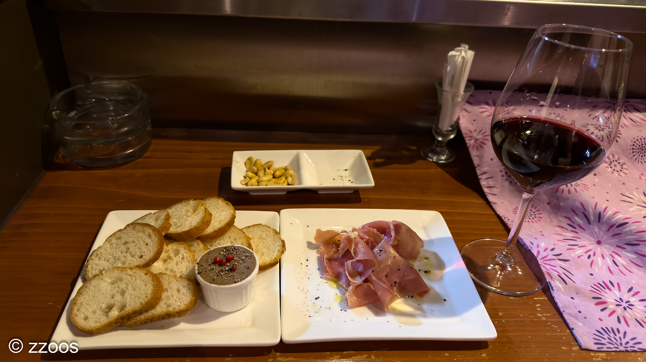 언제나처럼 시작은 스파클링입니다. 오토시로 내주신 파테(?)가 너무 맛있어서 이거 아예 한 접시 주실 수 있냐고 물어보니까 빵이랑 같이 듬뿍 퍼주셨어요. 그리고 배가 고팠는지 생햄도 주문했습니다.