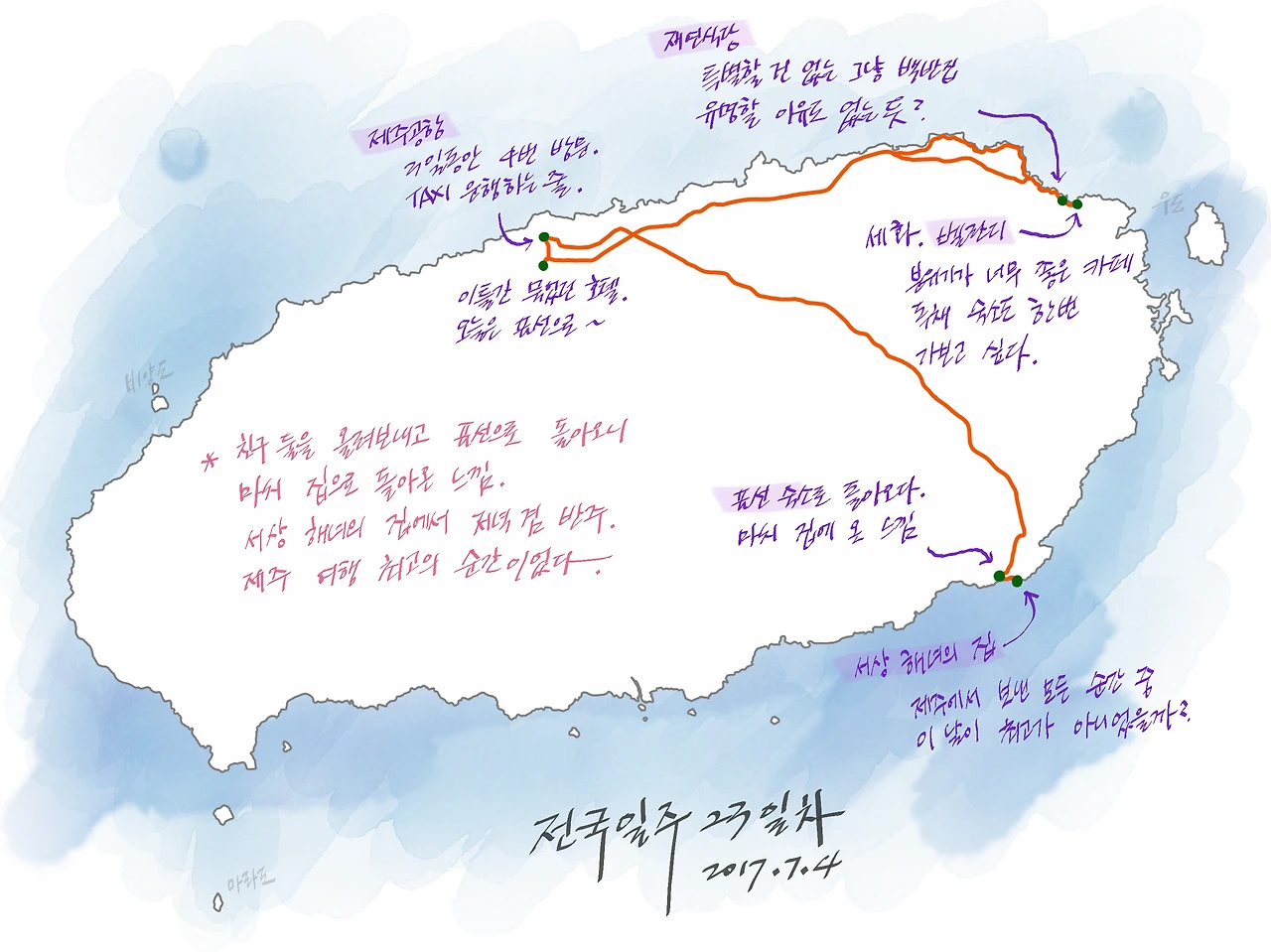 3명의 친구들 중에서 두 명을 공항에 내려주고 남은 친구와 함께 표선 숙소로 돌아왔다. 아직도 숙취를 완전히 해독하지는 못한 상황이라 말 그대로 바닥에서 뒹굴었다. 정말 뒹/굴/뒹/굴. 그렇게 얼마를 뒹굴었을까? 슬슬 배가 고픈 시간. 그리고 전날의 알콜은 모두 빠져나가고 몸이 새로운 알콜을 원하는 시간.