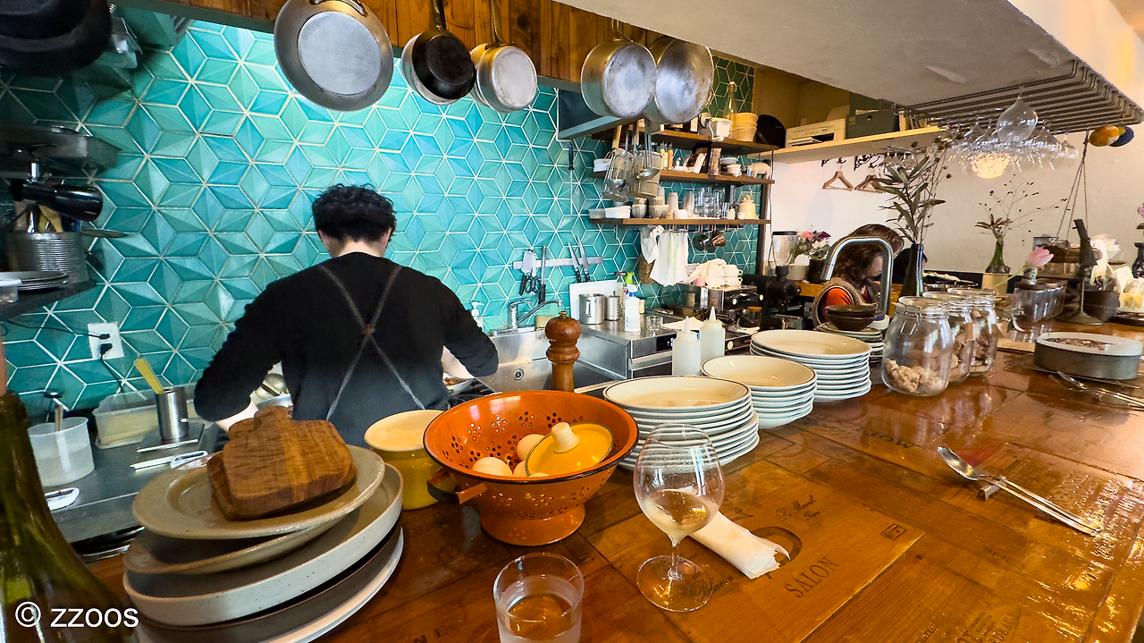 밖에서 보던 것과 내부는 분위기가 좀 달랐습니다. 지나다니면서 봤을 땐 가벼운 식당이라고 생각했는데, 안에 들어와 보니 훨씬 더 본격적인 곳이라는 느낌이 들었어요. 주방에 놓인 각종 무쇠팬과 스텐팬들이라거나 구석에 보이는 말코닉 그라인더 같은 것들을 보고, 조금 기대하게 되었습니다.