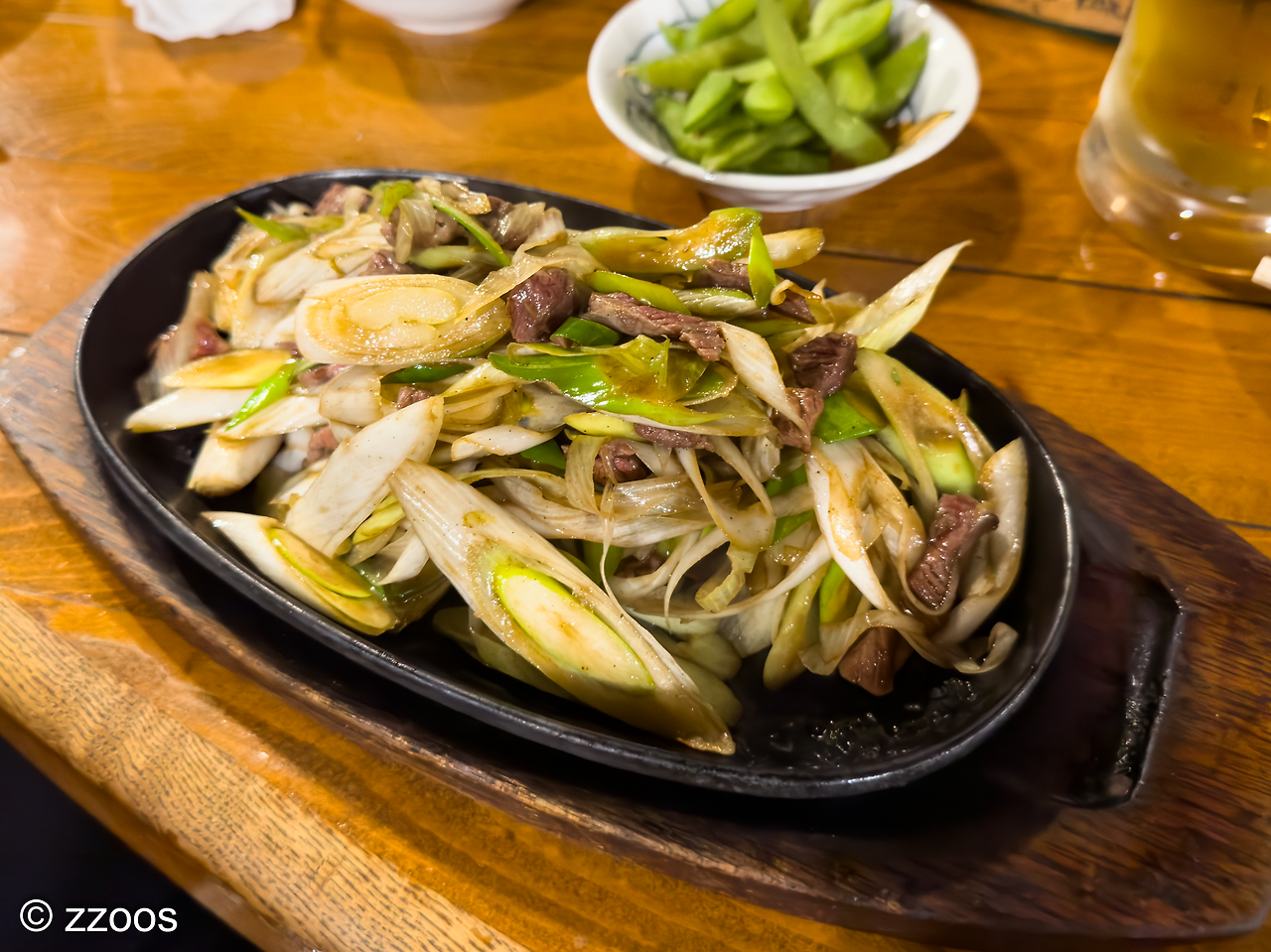 처음 주문한 것은 말고기 볶음(?)입니다. 잘게 자른 말고기를 대파를 잔뜩 넣어 함께 구웠어요. 말고기에 대한 왠지 모를 거부감이 있어서 잘 안 먹었었는데, 이번 여행에서는 결국 여러 번 먹게 됐네요. 하지만 매번 맛이 괜찮았습니다.