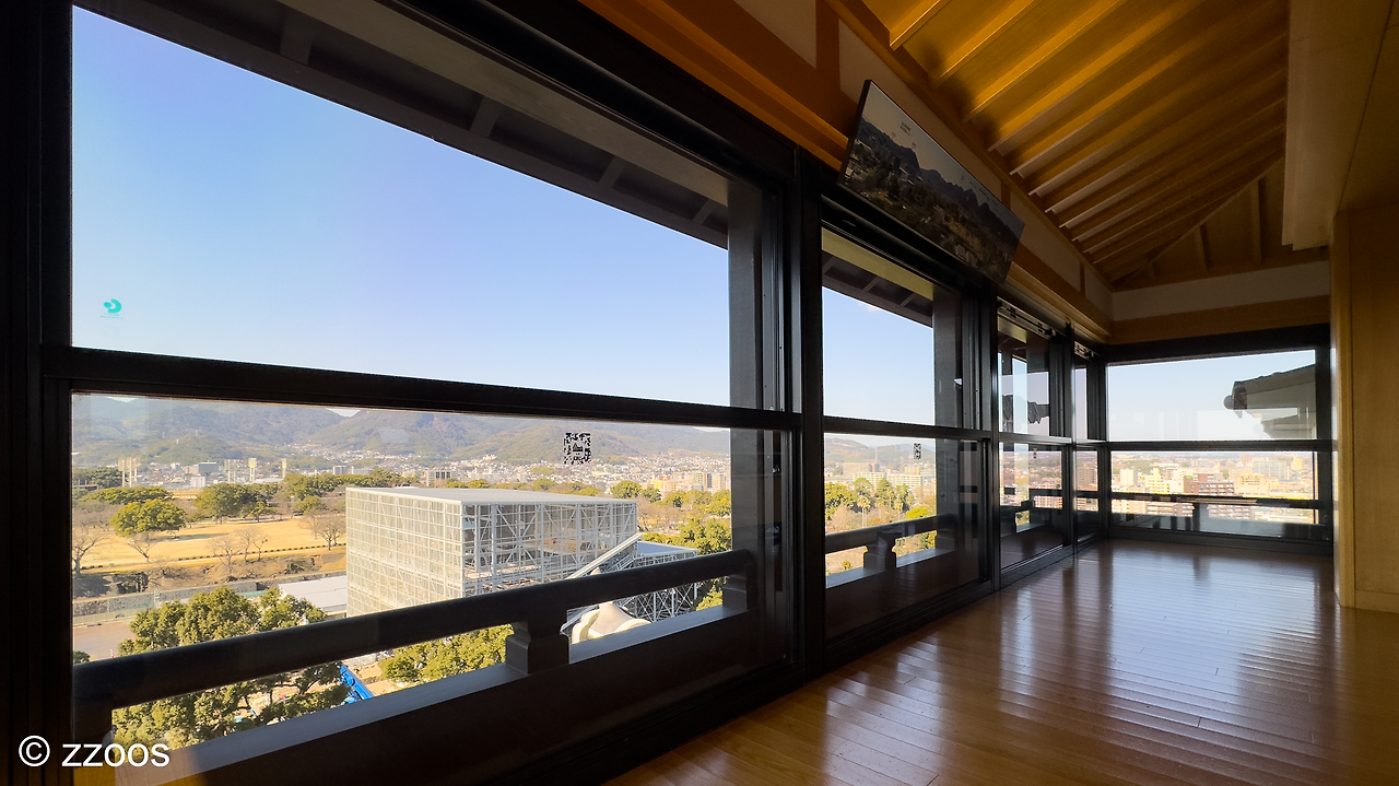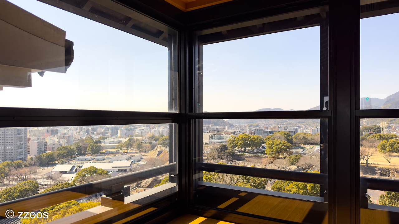계단을 걸어 올라가다 보면 '한 층의 넓이'가 점점 좁아지는 것을 느낄 수 있습니다. 그렇게 걸어 올라간 맨 꼭대기층. 솔직히 말해서 경치가 끝내준다는 느낌은 아닙니다만, 구마모토에 이 정도 높이의 건물이 없다 보니 이곳이 아니면 볼 수 없는 경치이기는 합니다. 사람이 꽤 많은 곳이라서 '사람이 없는 사진'을 찍기가 아주 힘들었어요.