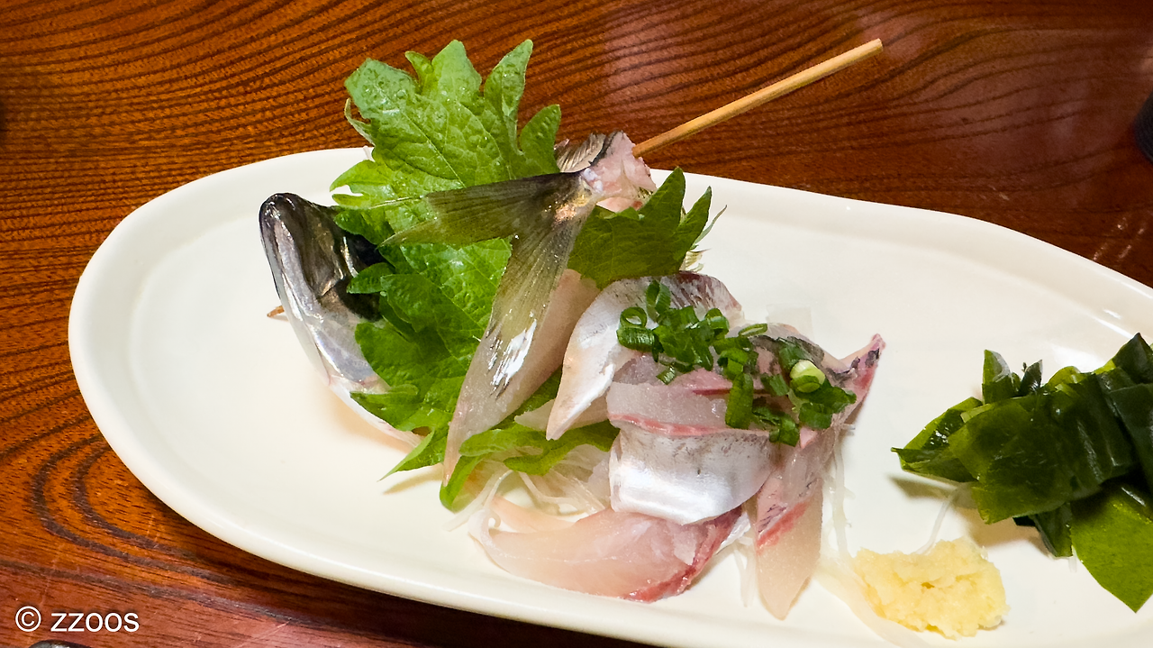 일단 이곳을 생각하면 전갱이 이케즈쿠리가 떠오릅니다. 가게 안에 활어 수조도 있어요. 일본에서는 대부분 숙성회를 사용하기 때문에 수조를 가지고 있는 가게가 별로 없죠. 이곳은 전갱이를 활어로 취급합니다. 사진처럼 회를 뜬 다음 원래의 뼈 위에 장식해서 내놓는 것을 이케즈쿠리라고 하더라고요. 타케나가에서는 '활 전갱이 세트'가 있는데요. 가격이 단돈 980엔입니다. 만원도 안 되는 가격에 전갱이 회와 생맥주 500cc 한 잔을 마실 수 있는, 저렴하고 파격적인 세트에요. 게다가 전갱이는 제가 제일 좋아하는 횟감이거든요. 한국에서는 쉽게 먹을 수 없죠.