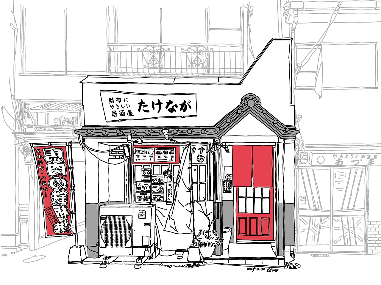 첫 번째로 그린 것이 바로 구마모토의 이자카야인 '타케나가(たけなが)'입니다. 바에서 만나 친해진 미조마타 상이 소개해준 집입니다. 테이블이 많지 않고 인기가 많은 가게라서 미리미리 예약하지 않으면 앉을 수 없는 곳이죠.