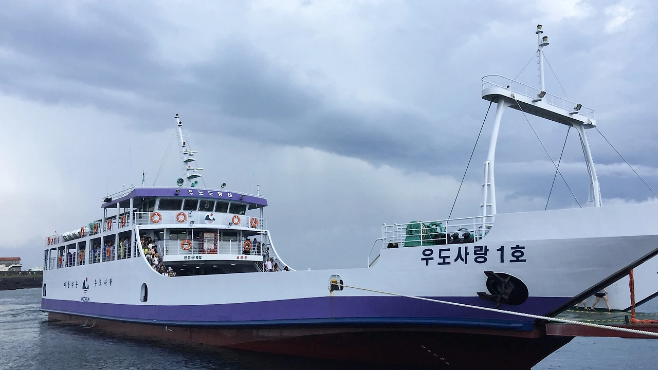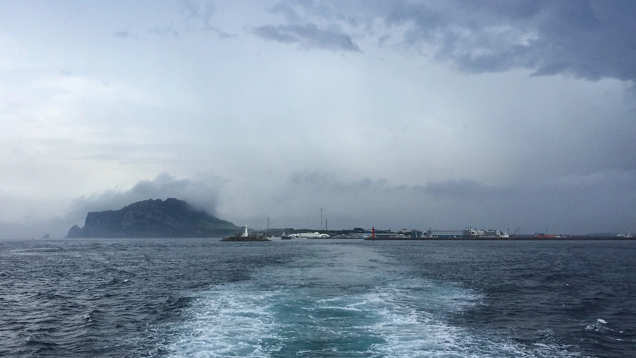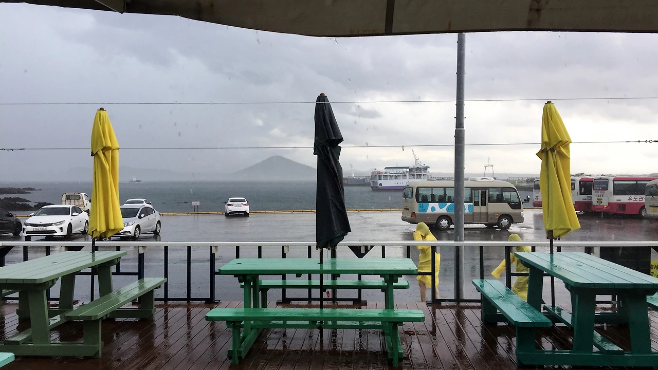여객터미널 주차장에 차를 세우는 시점에는 이미 우산 없이 맞기에 힘든 정도의 가랑비가 내리고 있었다. 여객선의 운항에 문제가 없는 정도. 사람들도 우산을 쓰고, 우비를 입고 배를 타고 있었다. 우리 둘은 '아냐, 이 비는 금방 그칠 거야'라며 헛된(?) 희망을 품고 배표를 끊었다.