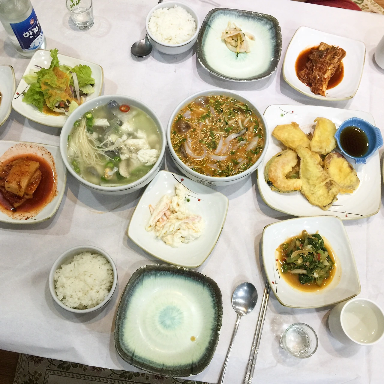 산책을 하다가 해가 저물고, 쏘주를 한잔 더해야겠길래 찾아 들어간 횟집. 간단하게 한치 물회랑 돔지리를 주문했는데, 상차림이 예사롭지 않다. 반찬들이 맛있다. 오호, 이 집 상호가 뭐였더라? 대양횟집(↗)이로구나.
