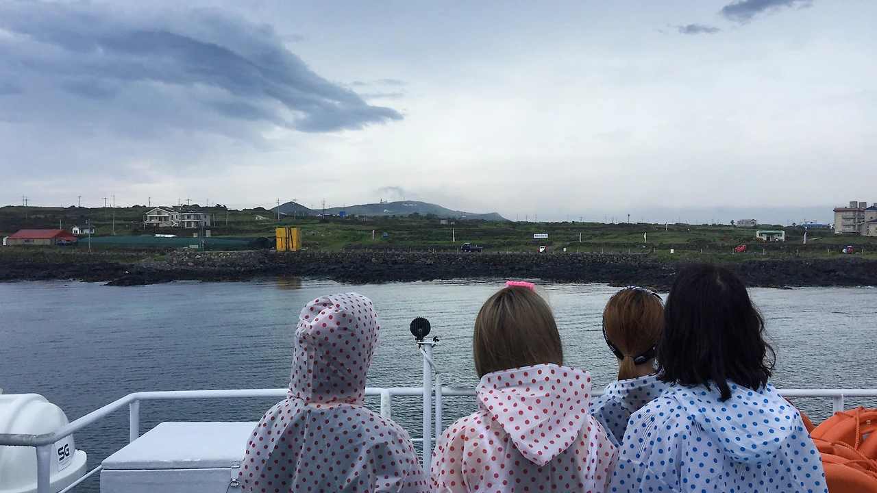 드디어 우도가 보인다. 빗방울이 살짝 작아진 것 같은 느낌도 들었다. 여객터미널 근처에서 땡땡이 우비를 팔고 있는지, 모두들 비슷한 우비를 입고 있었다.