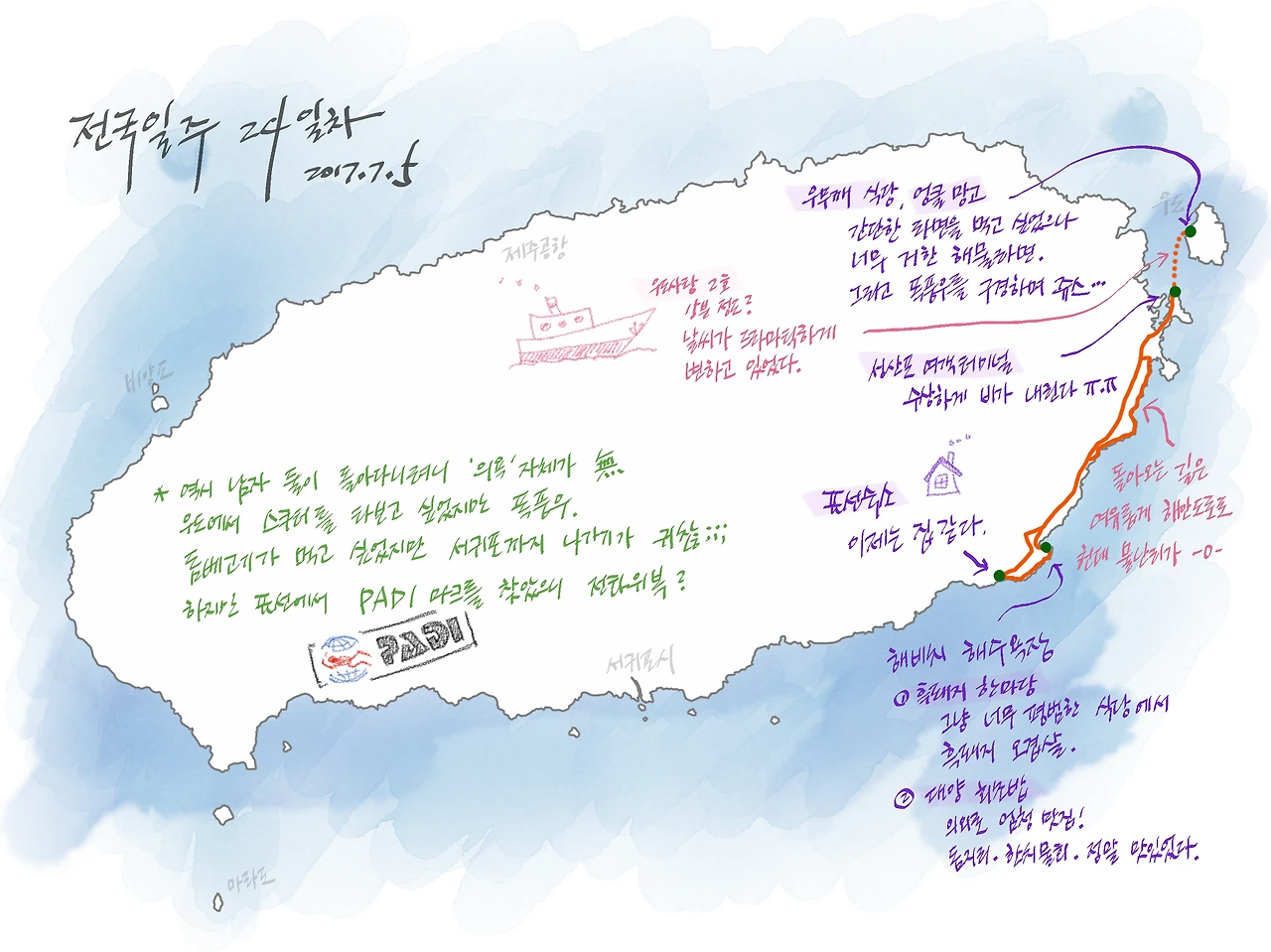 숙소에서 우도까지만 왔다갔다한 날이라 지도의 왼쪽이 텅 비어있어서... 유치원생 수준의 그림을 조금 같이 그려 넣어 봤습니다. 앞으로 조금씩 더 그려 넣어 볼까 하는 생각이 드네요. 자꾸 그려보면 초등학생 수준으로 업그레이드... 되겠죠?