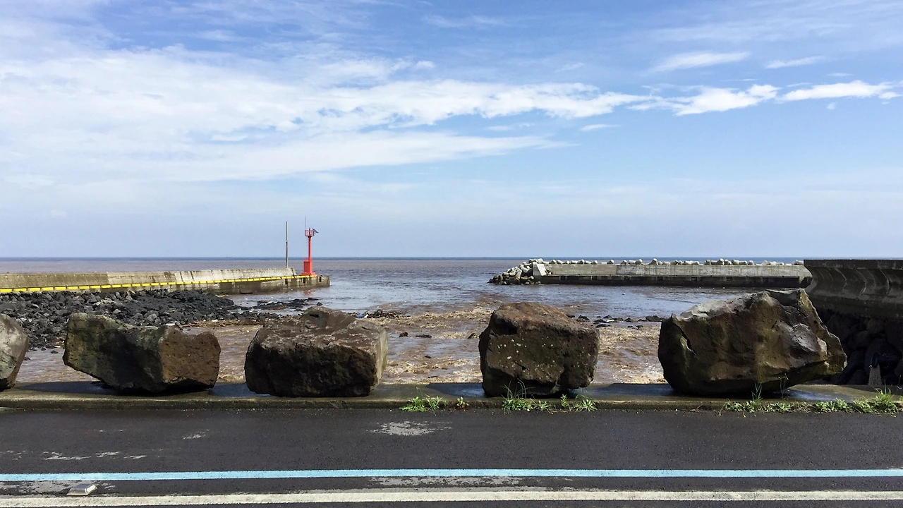 성산에서 해안도로를 따라 표선으로 돌아가는 길, 우도에선 그렇게 쏟아지던 폭우가 겨우 5분 정도 해안도로를 달리니 맑게 개어 있었다. 하지만 비가 엄청나게 내리긴 했나 보다. 엄청난 양의 흙탕물이 흘러내리고 있었다. 그리고 도로 곳곳이 침수되어 있었다.