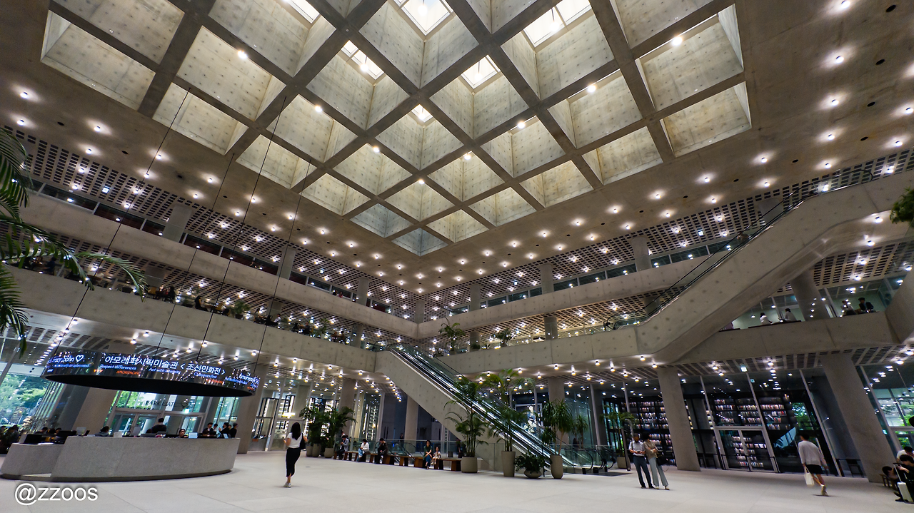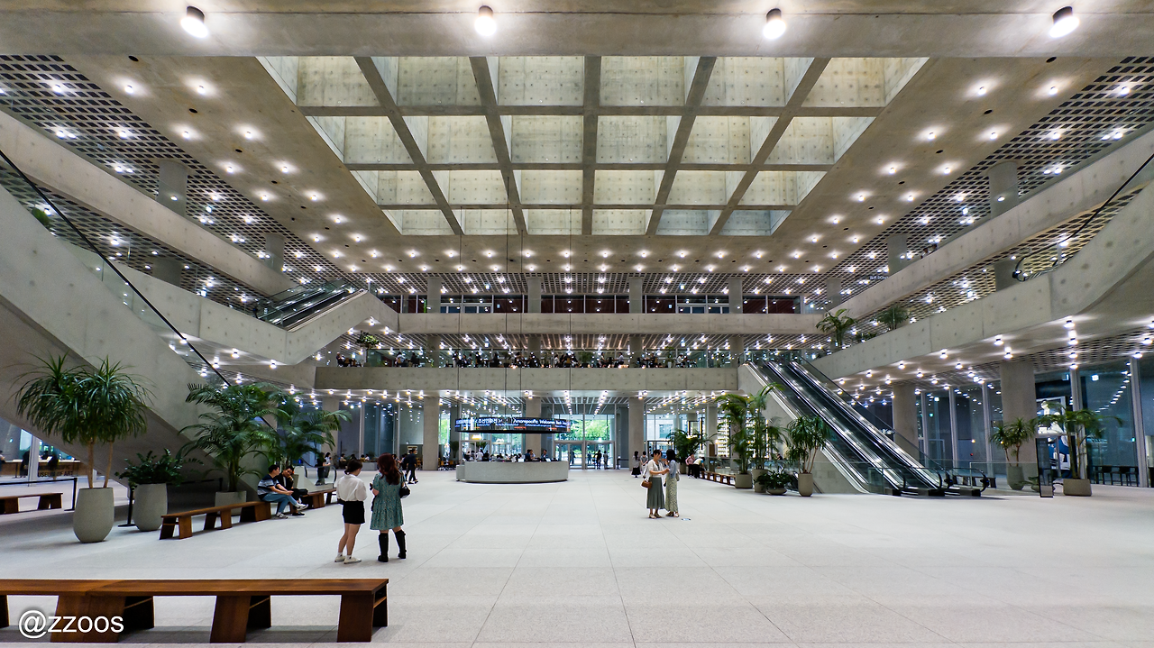 건물에 들어서니 1, 2, 3 층을 뻥~ 뚫어놓은 거대한 로비가 시원하게 펼쳐집니다. 카페나 식당들이 있는 상업 공간이네요. 노출 콘크리트를 아주 깔끔하게 시공했어요. 구석구석 디테일들이 아주 깔끔합니다.