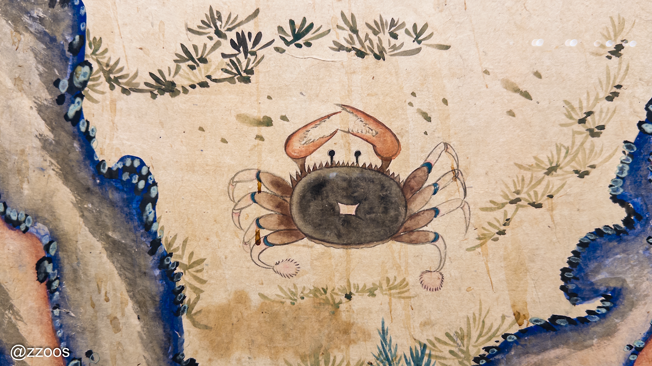 그래서 작품 옆에 붙어 있는 설명을 봤더니, 이건 '제주도'의 식생을 표현한 그림이라고 하더라구요. 제 마음에 들었던 '해학적인 그림'들이 제주도의 특산물들을 그림으로 표현했던 거예요. 그러고 보니 갑자기 옥돔이 보이지 않나요? 아, 그리고 저 푸른빛은 제주의 푸른 바다?
