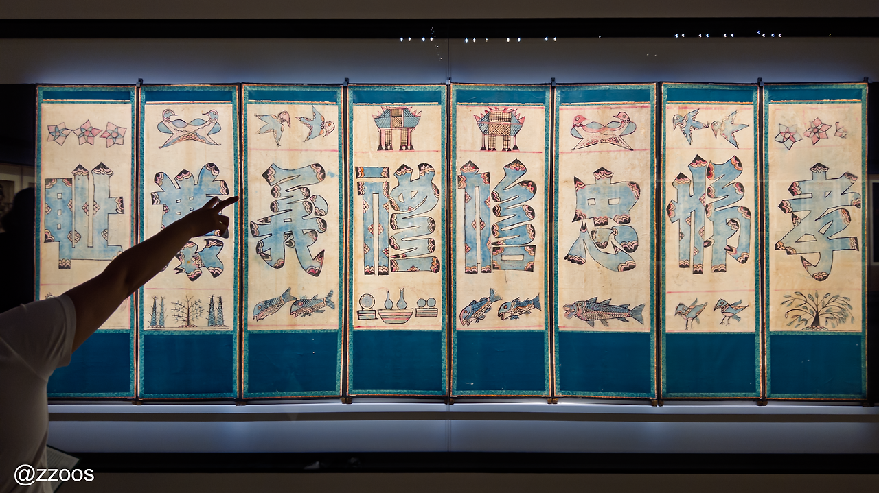 전시 초반부에서 가장 제 마음에 들었던 작품입니다. 효(孝), 제(悌), 충(忠), 신(信), 예(禮), 의(義), 염(廉), 치(恥)라는 여덟 글자를 그림으로 표현한 문자도예요. 전반적인 푸른빛도 좋았고, 과감하고 단순한 글자의 표현도 좋았지만 글자 위아래에 그려진 해학적인 그림들이 좋았거든요?