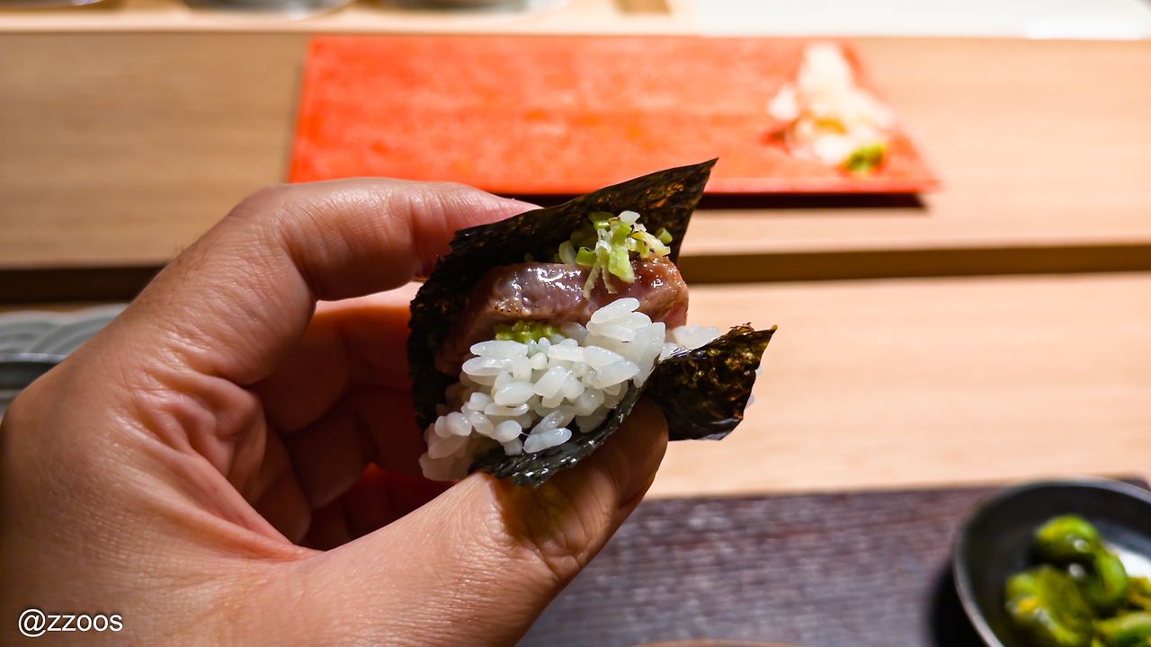 아홉 번째 스시는 뱃살이라고 하셨는데 오도로인지 쥬도로인지 모르겠습니다. 겉을 살짝 아부리한 다음 파와 함께 김으로 쌌습니다. 나쁘진 않았는데요. 참치 뱃살의 감동이 느껴지진 않았어요. 그래서 좀 아쉬운 한 점입니다.