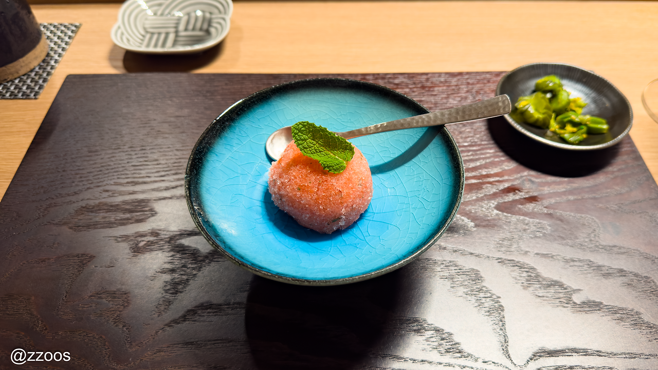 디저트는 토마토 셔벗입니다. 녹색으로 보이는 알갱이는 야채인데, 이게 좀 헷갈리더라고요. 시소 같기도 하고 아까 전갱이 위에 올렸던 바질 같기도 합니다. 토마토+바질은 누구나 알고 있는 조합이잖아요. 어쨌든 상큼하게 입안을 마무리하는 디저트로 오늘의 식사가 끝났습니다.