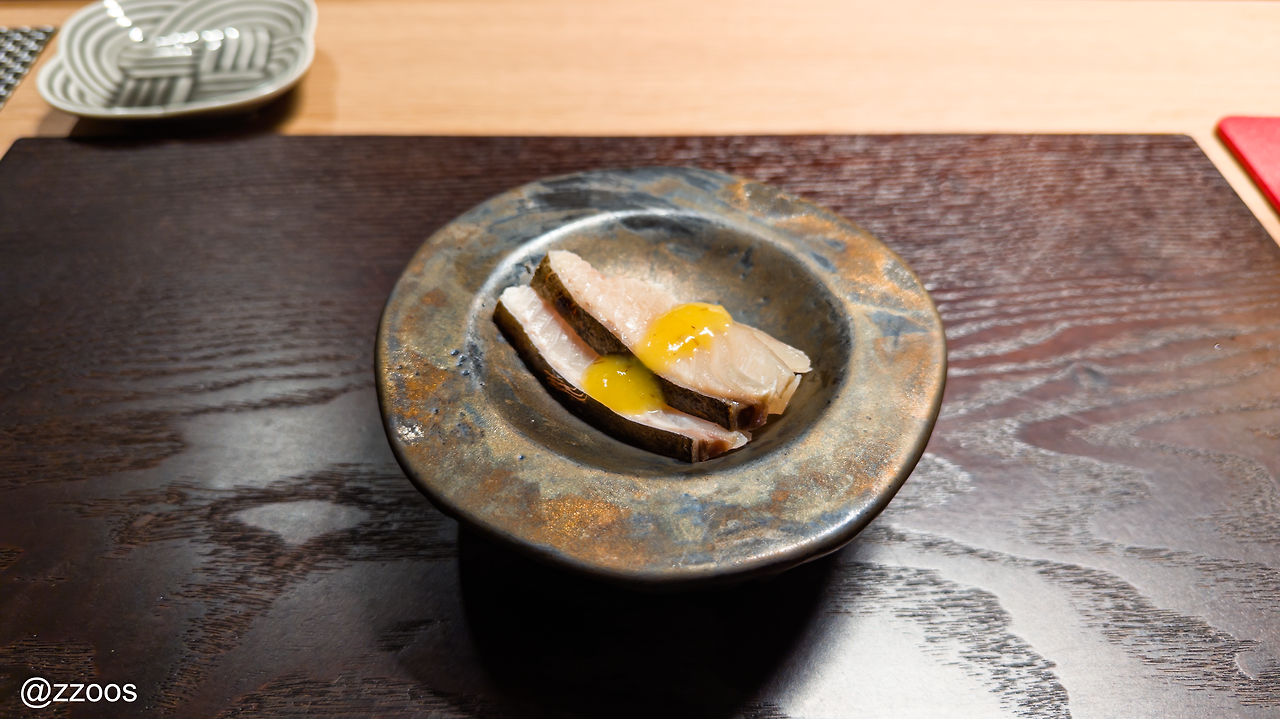 초된장을 바른 사와라(삼치)입니다. 볏짚을 이용해 살짝 아부리를 했어요. 초된장 덕분에 삼치가 아예 다른 요리처럼 느껴집니다. 특히 퍼석하지 않고 탱글해서 말씀해주시지 않았으면 다른 생선으로 착각할 뻔했어요. 마음에 들었던 한 점입니다. 아, 두 점이네요.