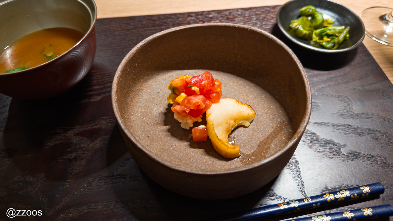 이 즈음에 야끼 모노(구이 요리)가 하나 나옵니다. 메로 구이였어요. 그 옆에는 튀밥(?) 위에 초당 옥수수가 들어간 살사를 올렸네요. 이것도 꽤 마음에 들었던 요리입니다. 오랜만에 먹는 메로가 상당히 맛있었어요. 그리고 살사가 아주 새콤한 게 입맛을 돋구더라고요. 토마토는 아삭아삭했고요. 솔직히 초당 옥수수는 잘 느끼지 못했습니다.
