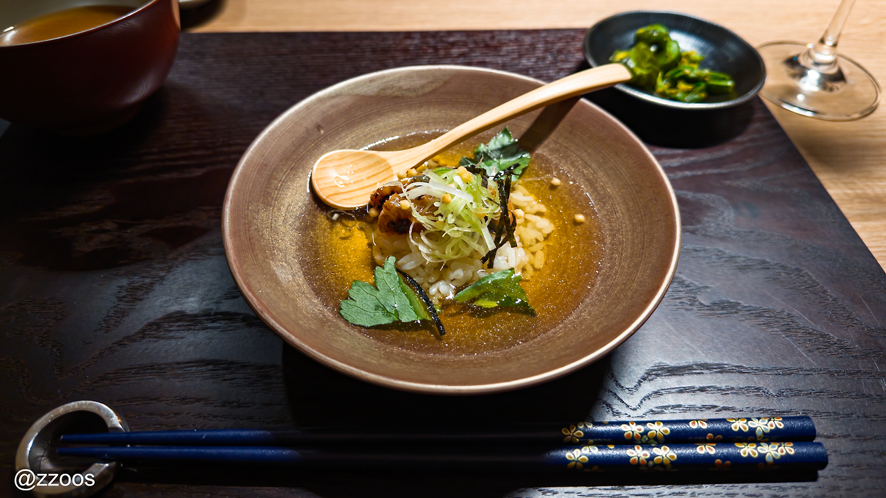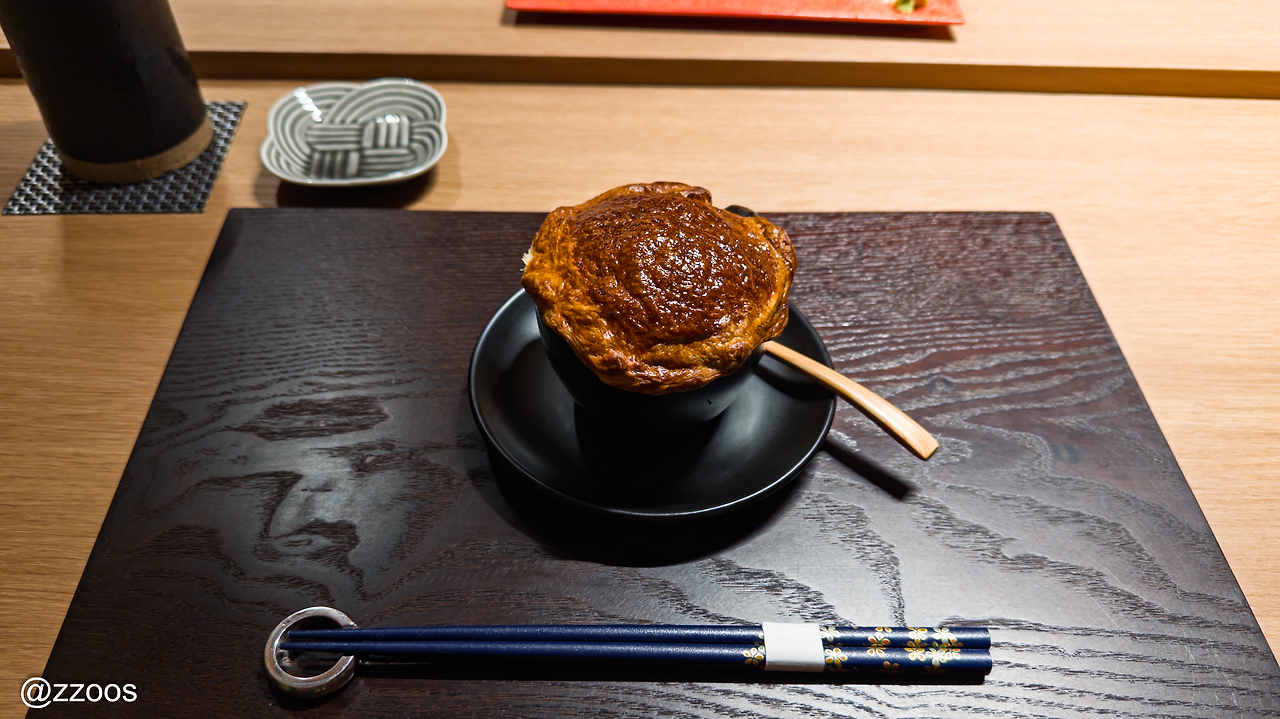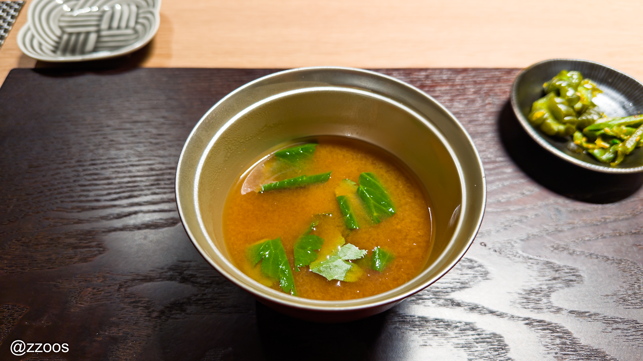 이 즈음에서 장국이 나왔습니다. 사진에 잘 표현이 안 된 것 같은데 진~한 아카 미소가 아니었을까 싶어요. 그리고 게로 육수를 내셨는지 고소한 꽃게의 맛과 향이 아주 진하게 우러나옵니다. 고개를 조금 갸웃? 했던 건, 참나물의 역할이 좀 애매했어요. 비주얼도 그렇고 맛이나 향도 저 된장국에 어울리는 게 과연 참나물이었을까? 하는 의문.