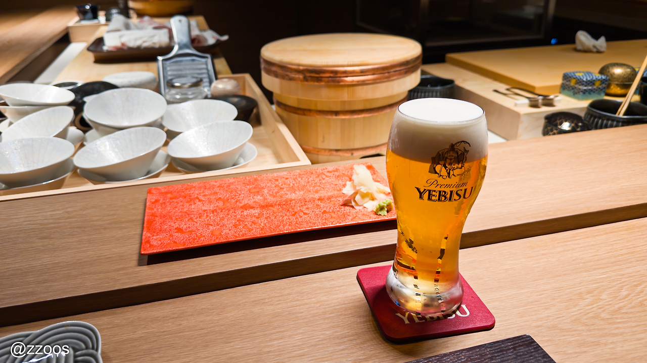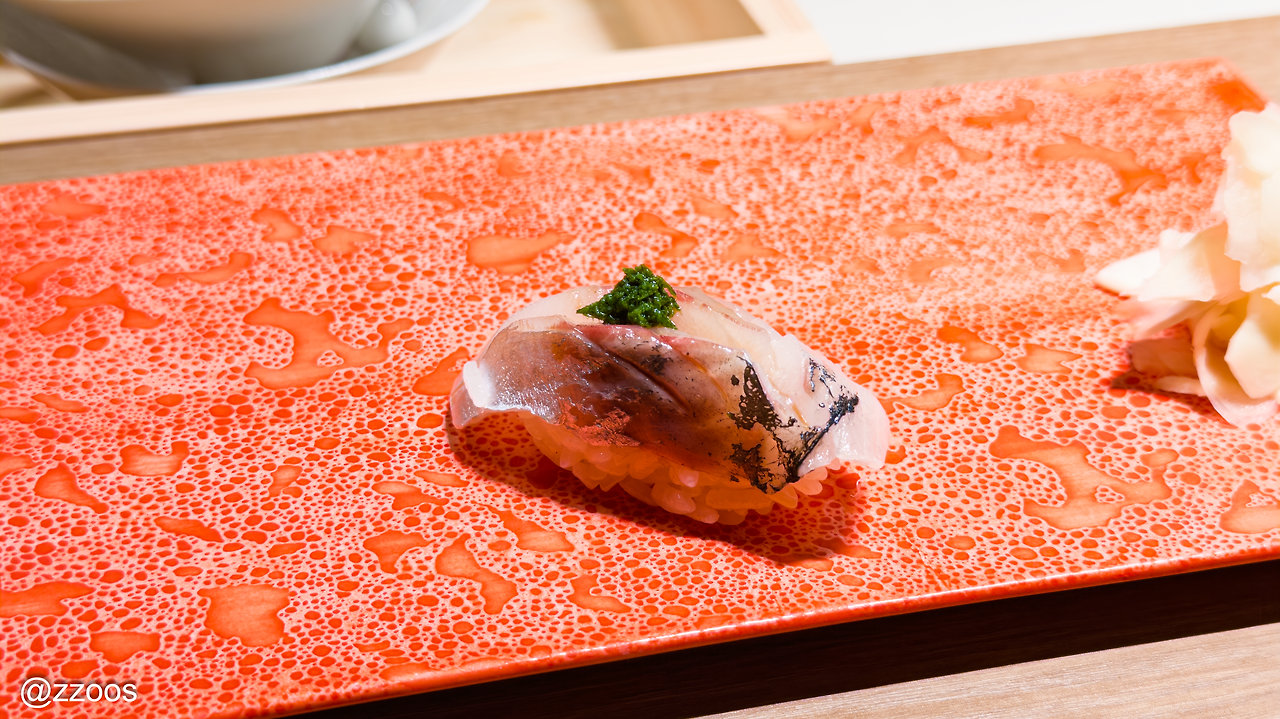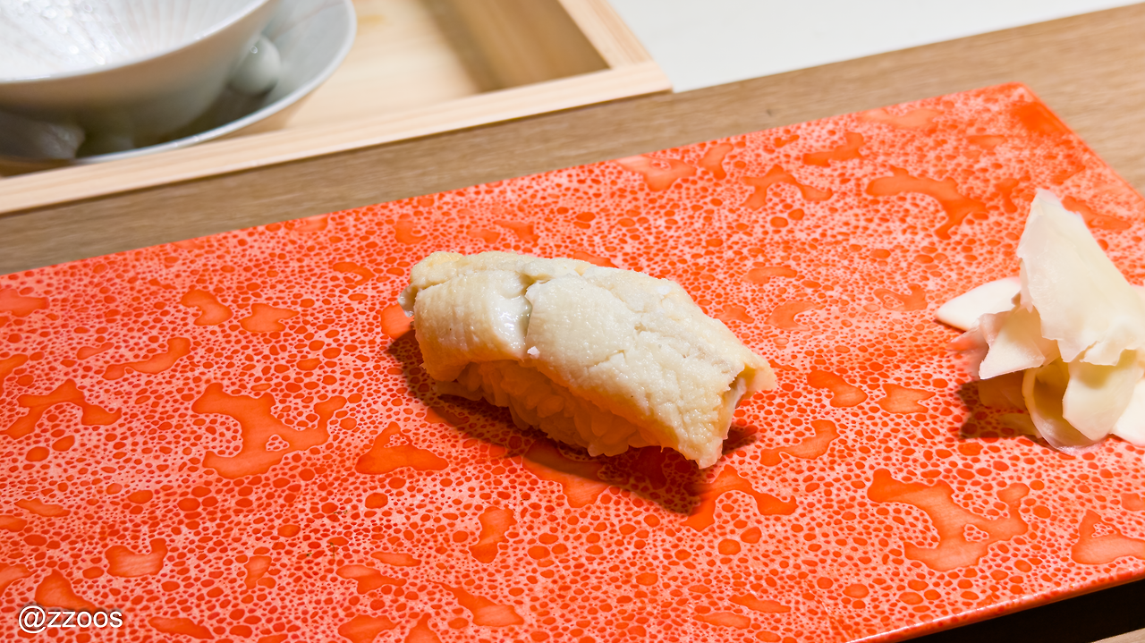 다음으로 스시가 시작됐는데요. 첫 점은 자연산 히라메(광어)였습니다. 헌데 제가 깜빡하고 사진을 못 찍었지 뭡니까 ㅠㅜ 그래서 사진은 없습니다만, 유자즙을 뿌리고 소금으로 간을 한 자연산 광어였는데요. 유자즙의 상큼함과 소금의 짠맛이 어우러져서 굉장히 기분 좋은 한 점이었습니다. 광어의 맛을 느끼기보다는 유자와 소금만을 느낀 것일 수도 있지만, 뭐 그래도 저는 좋았습니다.