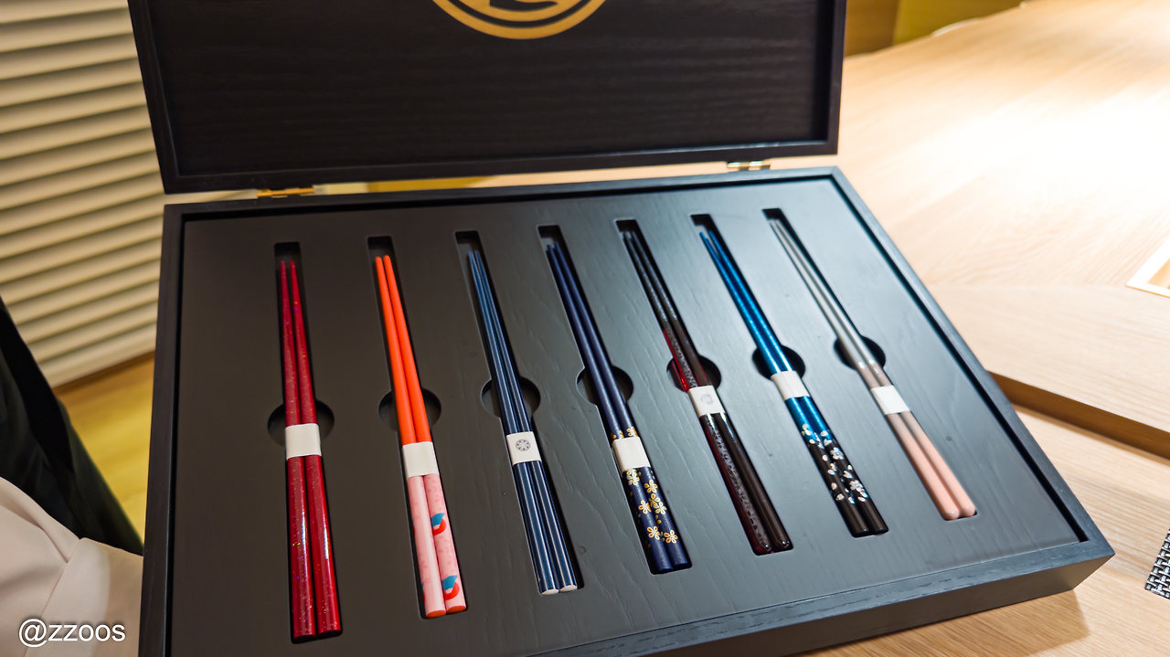 자리에 앉으니 바로 젓가락을 고르라고 합니다. 이자카야에서 니혼슈를 마실 잔을 고르는 것과 비슷한 시스템인 모양입니다. 저는 가운데에 있는 남색 젓가락을 골랐습니다. 사실 맨 왼쪽의 빨간 젓가락에 눈길이 가긴 했는데...