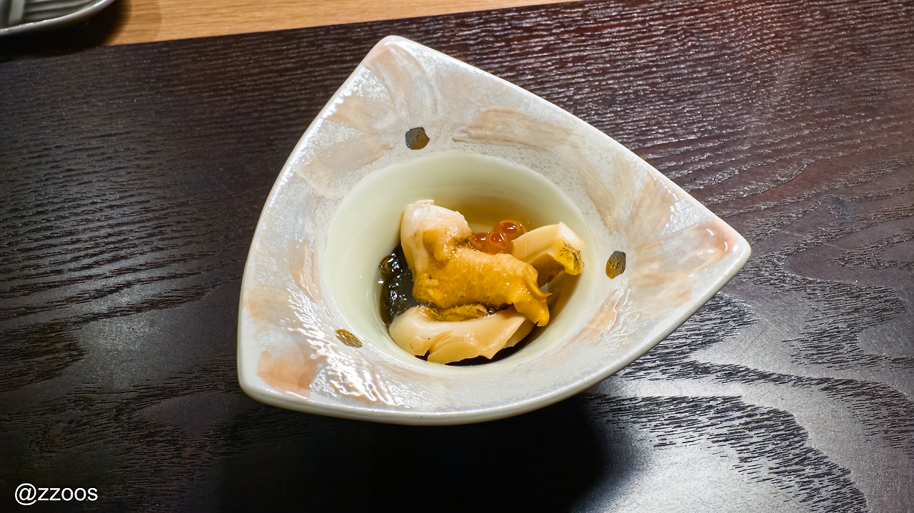 골뱅이, 모즈쿠, 이쿠라(연어알)입니다. 골뱅이가 제 취향에 비해서 과하게 쫄깃했지만 나쁘진 않았어요. 모즈쿠는 참 오랜만입니다. 좋아하는 해초입니다. 전반적으로 모즈쿠의 시큼 상큼함 덕분에 맛있게 먹을 수 있었습니다.