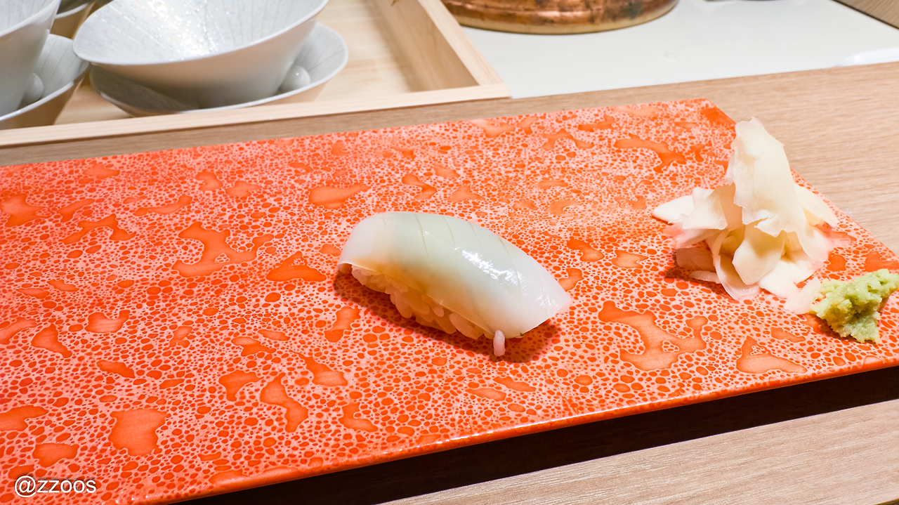 네 번째 스시는 스미이카(갑오징어)입니다. 여기서도 유자와 소금의 터치가 느껴졌어요. 거기에 더해서 시소향도 느껴지던데 셰프님께 여쭤보진 못해서 확실하지 않네요.