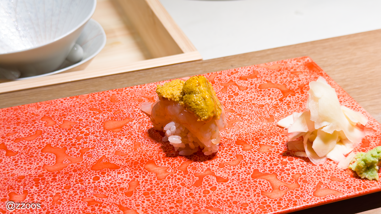 다섯 번째 스시는 우니(성게)와 아마에비(단새우)입니다. 이건 뭐 실패하기 힘든 조합이죠.