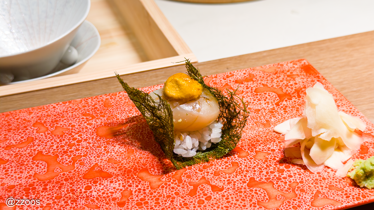 일곱 번째 스시는 감태로 둘러싼 가이바시라(키조개 관자)와 우니(성게) 크림입니다. 이것도 뭐 실패하기 힘들죠. 우니를 그대로 올려주셨으면 더 좋았으려나? 싶기도 하지만 우니 크림도 나쁘지 않았어요.