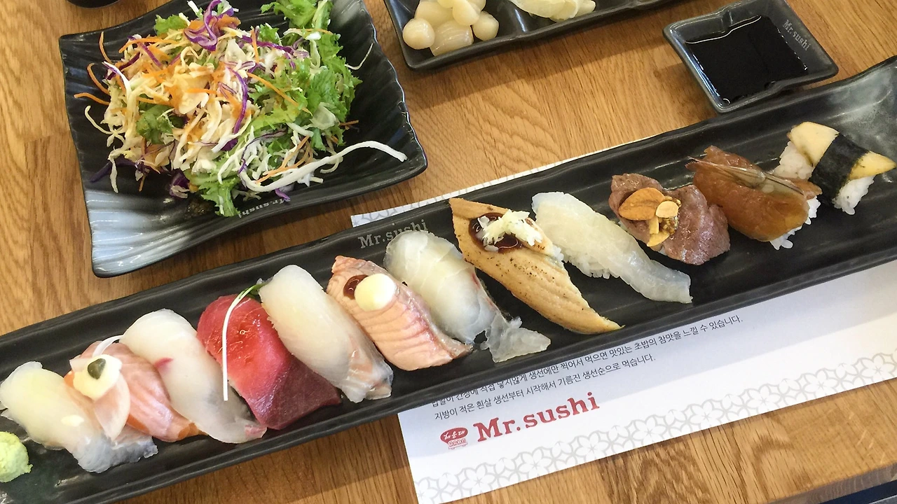 차를 근처 식당에 세워두고 살랑살랑 걸어서 간 곳은 미스터 스시(↗)라는 집. 평범한 보급형 스시집인데, 가격도 맛도 구성도 평범해서 근처 회사원들에게 인기가 있을 것 같은 식당이었다.