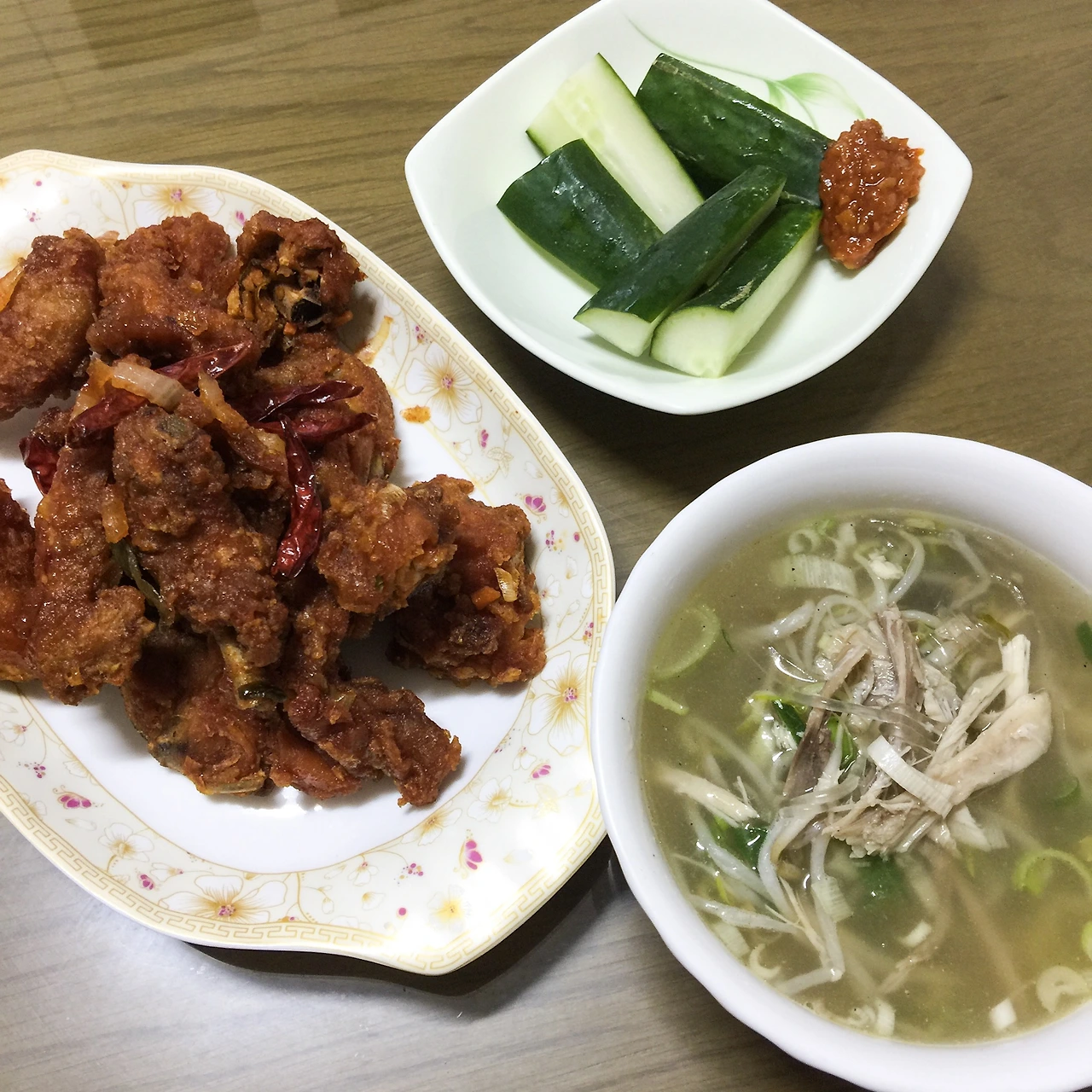 정말 집에 도착 아니 숙소에 도착하자마자 급하게 상을 차렸다. 배가 고팠기 때문이기도 했지만, 포장한 깐풍기가 차 안에서 풍기는 그 냄새가 너무 식욕을 자극했다. 꽤 바삭하고 매콤한 맛도 배어 있는 깐풍기. 뼈째로 튀겼기 때문에 뼈를 발라 먹어야 한다는 귀찮음은 있지만, 뼈 없는 그러니까 살을 발라 둔 닭고기들은 오히려 선도나 원산지에 문제가 있는 경우가 있다고 해서 치킨을 주문할 때도 뼈가 있는 걸 주문하는 스타일이라 별 문제가 안 된다.