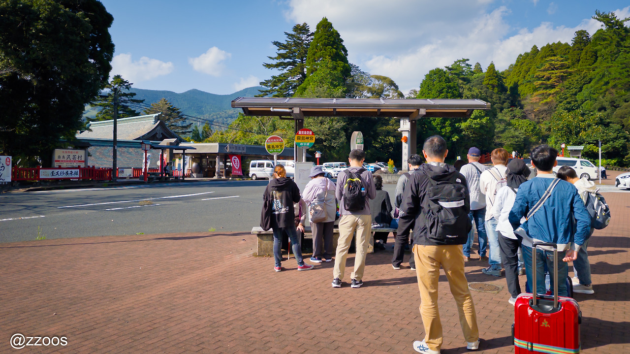 밥을 다 먹고서 버스 정류장에 나가보니, 제가 타려고 했던 키리시마 진구 액세스 버스보다 먼저 도착하는 버스가 한 대 있었습니다. 그걸 타고서 키리시마 진구 역으로 내려가기로 합니다.