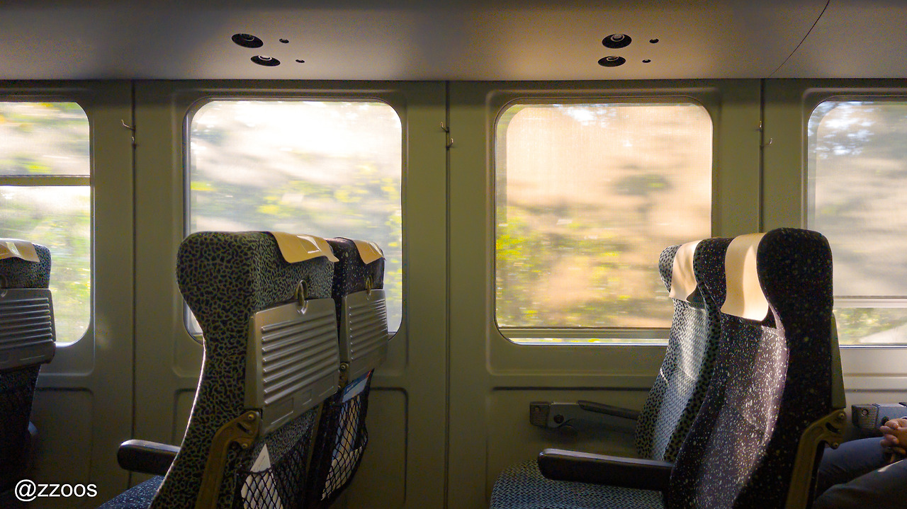 숲 속을 달리는 열차에 분위기 좋은 오후의 햇살이 드리웁니다. 승객이 별로 없어서 한적한 열차는 영화 같은 분위기가 되었어요. 따스한 이 풍경이 기분 좋습니다.