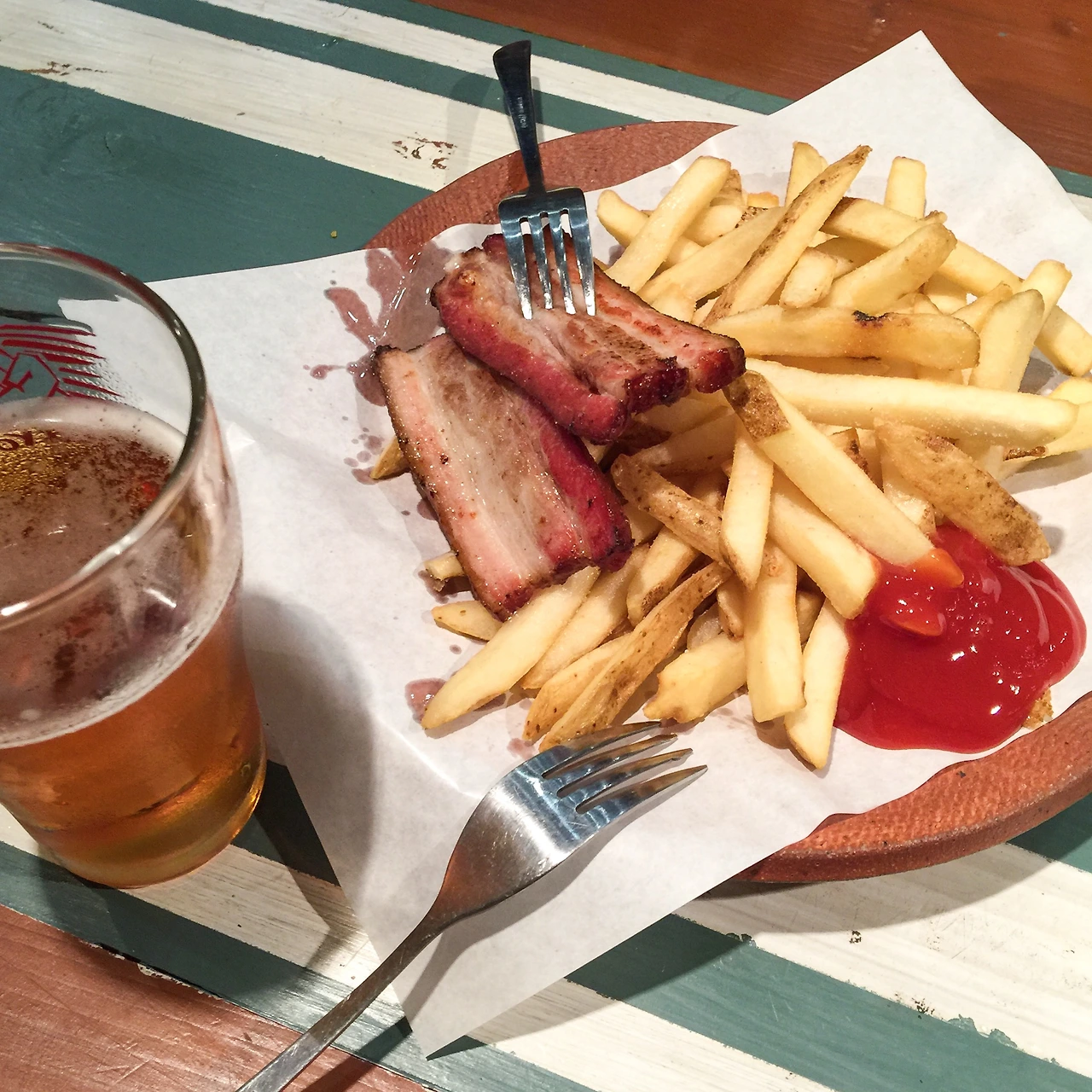 1차를 마치고 나니, 같은 건물 3층에 있는 웨이브라는 수제버거집. 햄버거도 매우 궁금했으나 오겹살을 너무 거하게 먹어서 간단하게 감자튀김을 시켜서 맥주를 마시고 있자니 서비스로 수제 베이컨을 조금 내주셨다. 오~ 베이컨이 두툼한데 불맛이 확 올라오면서 짭짤한 그 맛이 정말 일품.