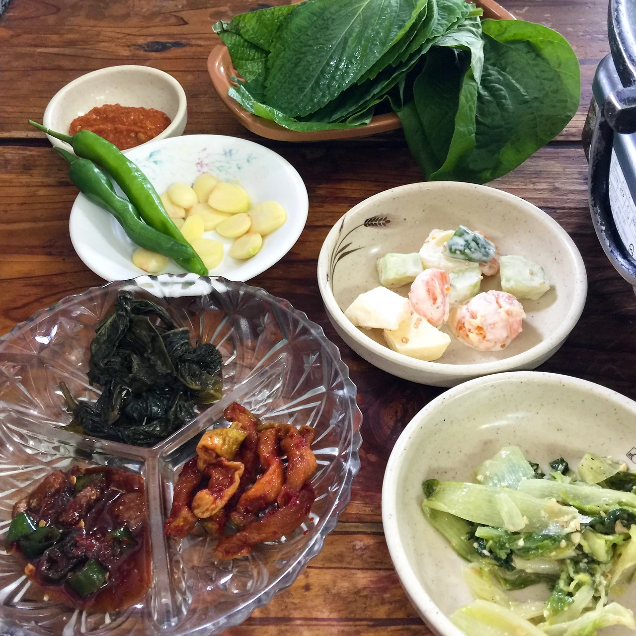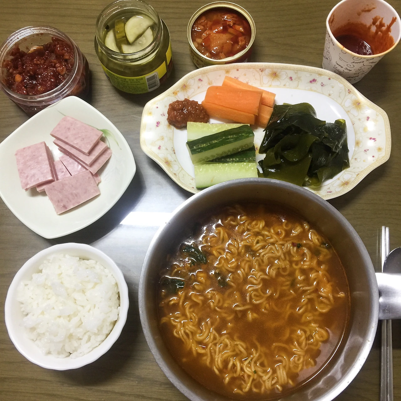 숙소에 돌아왔더니 어느덧 저녁시간. 이거 저거 준비하기가 귀찮아서 햇반을 데우고, 라면을 끓여서 간단하게 상을 차... 리려 했는데, 숙소 사모님이 주신 야채도 남아있고, 안주로 사왔던 미역도 남아있고, 괜히 스팸과 참치까지 꺼내서 엄청 거한 상이 차려졌다.