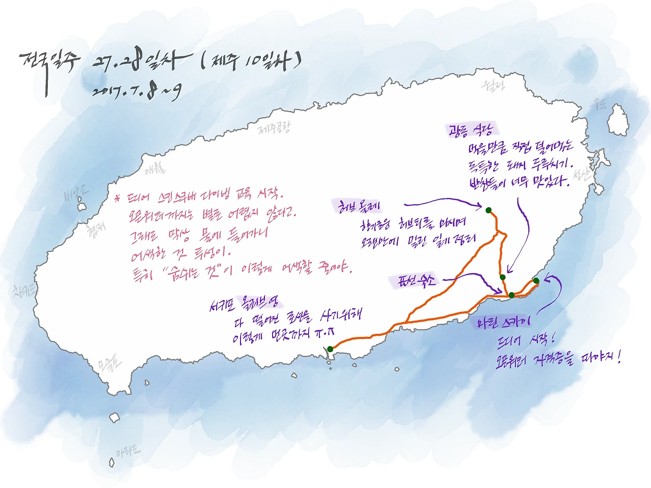 며칠 전 표선에서 산책하다가 우연히 발견한 다이빙 샵에서 상담을 받았고, 어제 전화로 수업을 언제부터 시작할 수 있냐고 여쭤보니 언제든지 오라고 하셔서 바로 오늘! 10시부터 시작이다.
