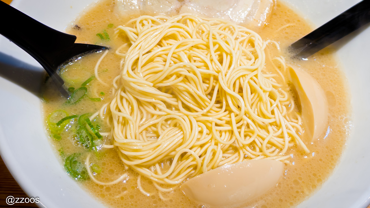 오, 비주얼을 보니, 기대가 커졌습니다. 정말 제대로 된 하카타 라멘일 것 같은 기대감. 그리고 실제로 그랬습니다. 면은 가늘고, 제대로 카타입니다. 심부의 식감이 살아 있는, 스파게티로 치면 알덴테의 면. 육수는 깔끔하지만 진한 돈코츠 육수입니다. 제 취향이라면 좀 더 끈적하고 냄새도 심하게 진한 육수도 괜찮긴 한데, 이렇게 깔끔하니까 먹기는 훨씬 편하네요.