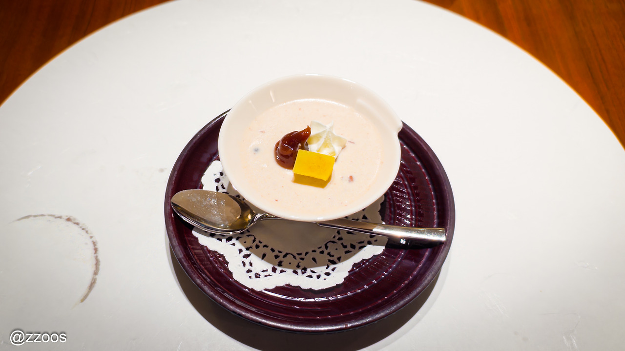 어느덧 식사를 마치고 디저트의 시간입니다. 디저트는 팥으로 만든 무언가가 나왔는데요. 이걸 아이스크림이라고 해야 할지 푸딩이라고 해야 할지 모르겠습니다. 아이스크림의 질감이라고 하기엔 푸딩 같은데, 푸딩이라고 하기엔 아이스크림의 맛이 나거든요. 여튼 맛있는 디저트였습니다.