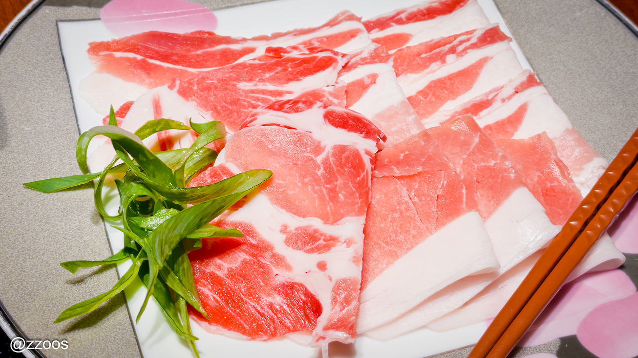 샤부샤부용 고기는 등심, 목살, 삼겹살로 총 세 부위가 나오는군요. 등심의 씹는 맛도 좋고, 목살의 밸런스도 좋은데요. 역시 지방의 고소함을 더 잘 느낄 수 있는 건 삼겹살이 아닌가 싶어요. 아, 아닌가? 목살도 고기와 지방의 밸런스가 절묘해서 너무 맛있습니다. 네, 맞아요. 이건 뭐가 더 좋다고 말하기 힘듭니다. 그냥 다 맛있어요. 제가 가고시마에 올 때마다 쿠로부타 샤부샤부를 먹는 이유입니다.