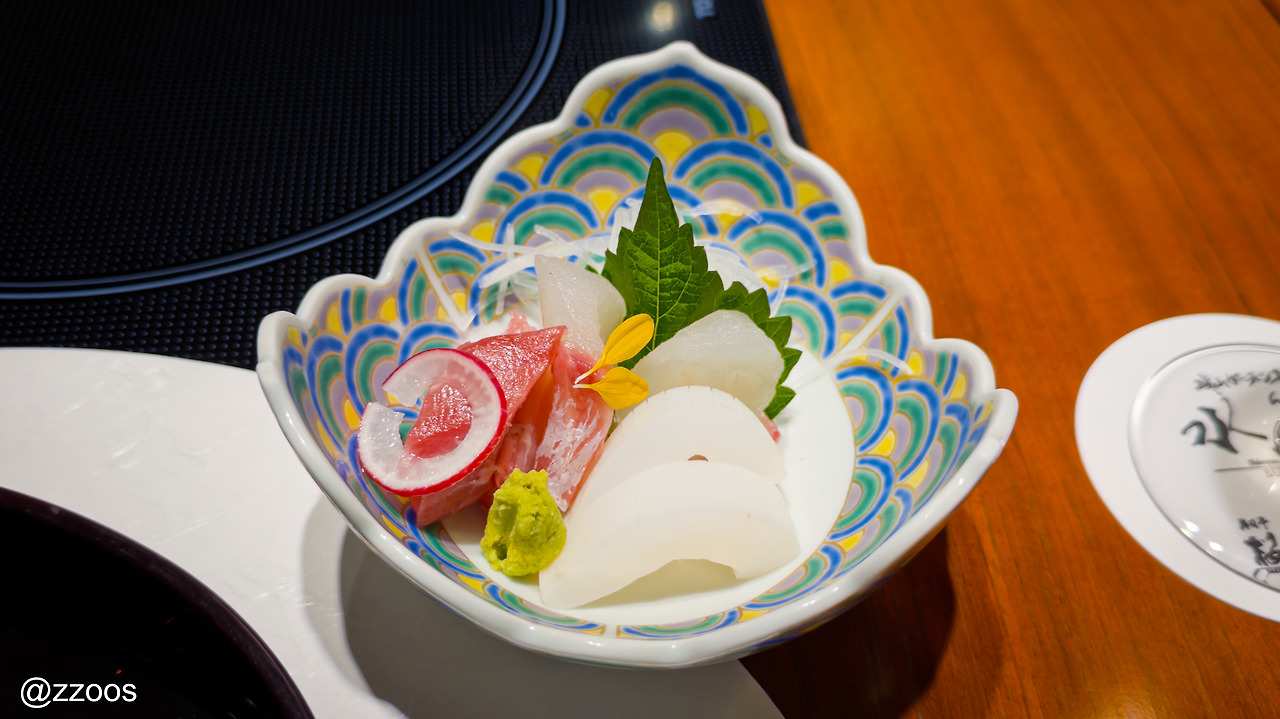 다음으로 나온 것은 사시미 3종. 혼마구로(참다랑어), 마다이(참돔), 미즈이까(무늬오징어)입니다. 신선한 사시미들. 역시 가고시마는 해산물이 풍부한 곳입니다.