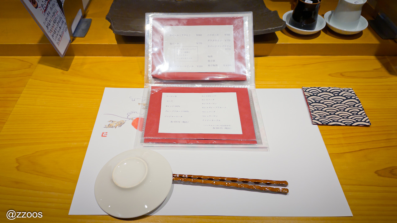 예약할 때 코스를 미리 정해두었기 때문에 도착하면 음료를 주문하고 바로 코스가 시작됩니다. 사시미와 요리가 포함되는 좀 긴 코스도 있는데요. 저는 입이 짧아서 그냥 스시 코스로 예약했습니다.