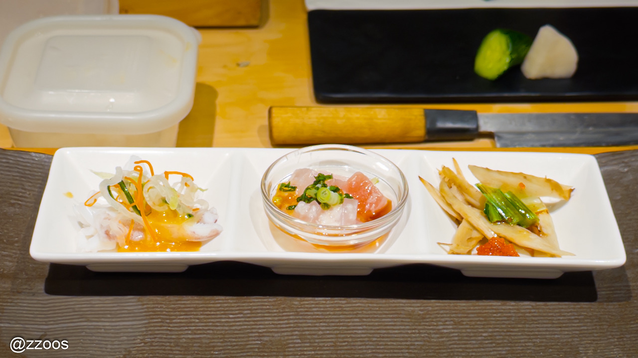 자리에 앉으니 바로 애피타이저가 나오는군요. 데친 이까게소(오징어 다리). 간파치(잿방어)와 아키타로(돛새치) 위에 야마이모(산마) 갈아서 올린 야마카케. 그리고 고보우아에(우엉 무침)입니다. 하나같이 맛있어서 기대감이 커졌습니다. 여기, 보통 가게가 아닌데? 하는 느낌.