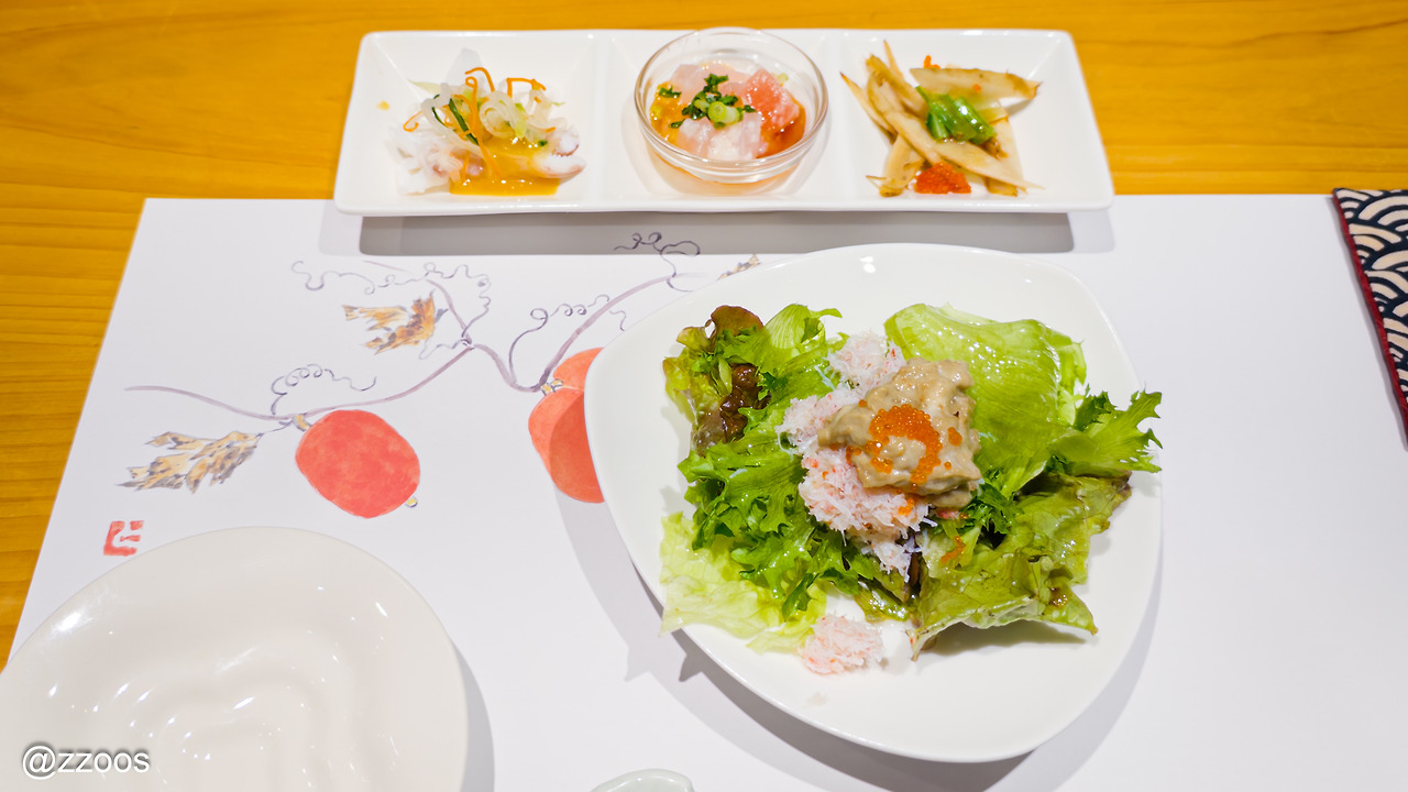 다음으로 홋카이도 즈와이 카니(대게)의 게살과 내장을 올린 샐러드입니다. 비주얼을 보고 큰 기대가 없었는데, 게살과 내장을 먹어보니, 이거 엄청 맛있네요. 역시 홋카이도의 대게인가요. 이게 뭐라고 이렇게까지 맛있을 일일까요.