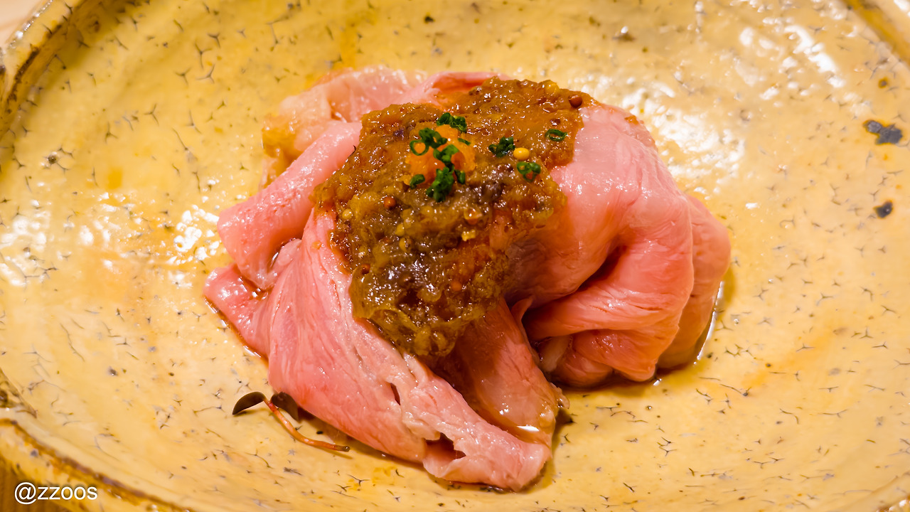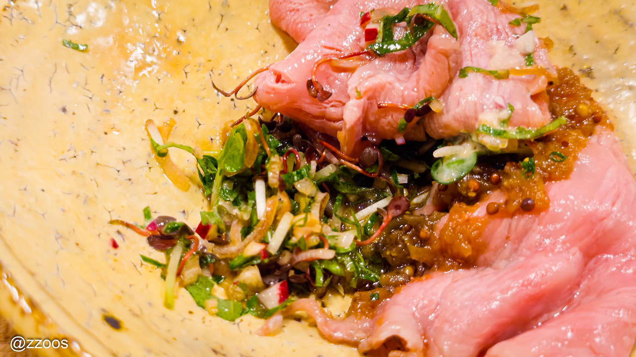 제가 직접 샤부샤부하는 건 아니고 주방에서 살짝 익혀서 나오는 거군요. 핑크빛으로 잘 익힌 소고기 위에 소스를 뿌렸는데요. 고기를 들춰보니 그 안에 잘게 썰어둔 야채들이 가득합니다. 크기가 좀 커서 반으로 잘라서 먹었는데요. 이것도 너무 맛있습니다. 부드러운 건 둘째고 소스도 기가 막히고, 아주 살짝 피어오르는 기분 좋은 피 냄새와 육향이 신선해서 맛이 기가 막혀요. 입 안에서 맛이 폭발한달까요.