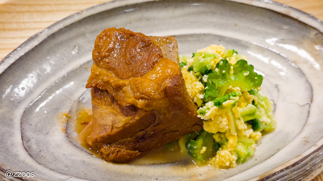이번엔 메뉴판에 있는 요리가 나왔습니다. 쿠로부타 돈코츠(黒豚豚骨)와 고야(여주) 볶음. 가고시마의 전통 요리라고 합니다. 제 생각에 이건 오키나와의 영향을 받은 요리가 아닐까 싶어요. 고야 찬푸르는 오키나와의 대표 요리잖아요. 그리고 돼지고기를 삶아 먹는 문화도 오키나와에 많이 발달해 있죠.