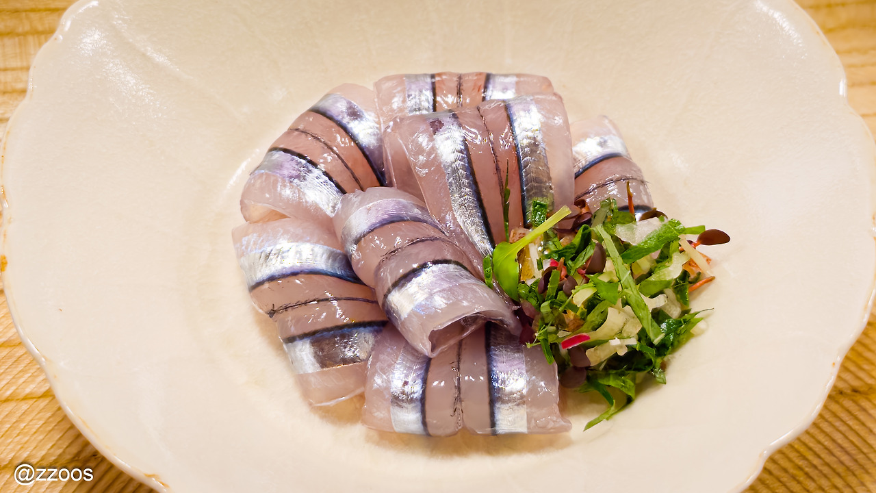 다음은 키비나고 사시미(きびなご刺身)입니다. 아주 예쁘게 생겼죠. 가고시마 하면 떠오르는 장면 중의 하나입니다. 키비나고는 우리말로 샛줄멸인데요. 남쪽 지방에서는 꽃멸치라고도 부릅니다만, 실제로 멸치와는 종이 좀 다릅니다. 제주에서 '멜젓'을 만들 때 쓰는 게 멸치가 아니라 바로 이 샛줄멸이라고 알고 있어요.