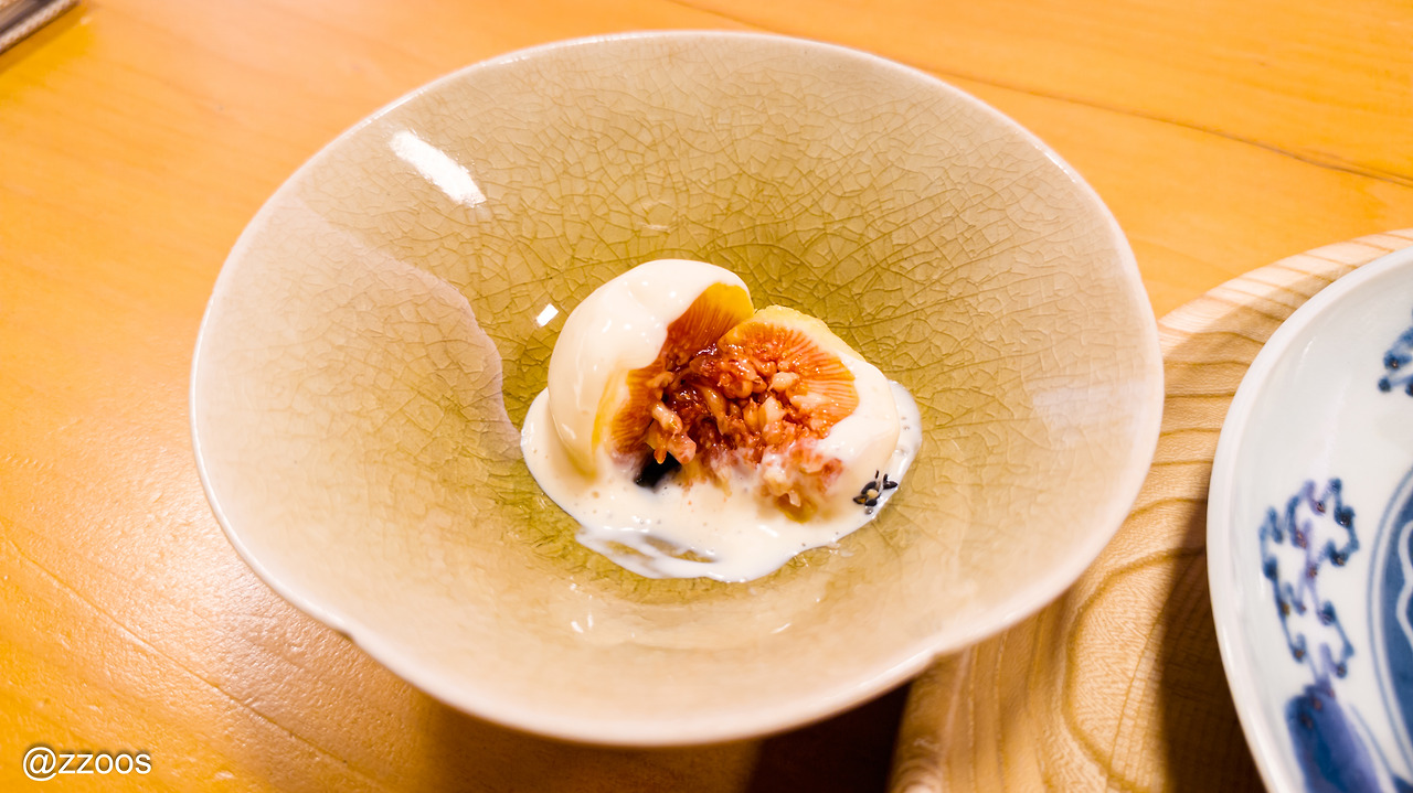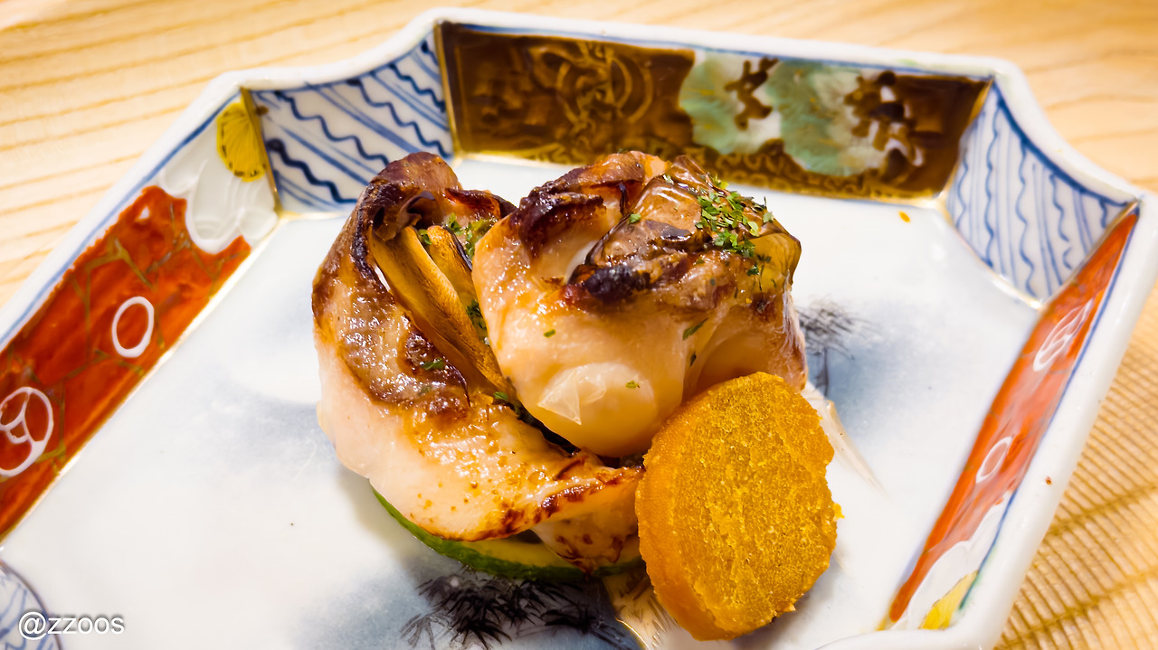 애피타이저 플레이트에는 총 6개의 요리가 놓여 있습니다. 메뉴에는 5종이었지만 주방장님이 하나 더 만드셨다고 해요. 왼쪽 위의 것부터 반시계 방향으로 아지(전갱이) 난반즈케와 오크라, 살짝 구운 도미살 위에 참깨 소스, 삶은 밤과 은행과 가고시마산 고구마, 미소를 발라 구운 두부, 카라스미 파우더를 뿌린 장어 시라아에(두부, 참깨와 함께 무치는 요리)가 놓여 있고요. 가운데에 주방장님이 추가로 만드신 요리가 놓여 있는데, 정확하게 뭔지 잘 모르겠습니다. 설명해 주실 때 참치를 언급하긴 하셨어요. 참치 젤리 같은 거랄까.