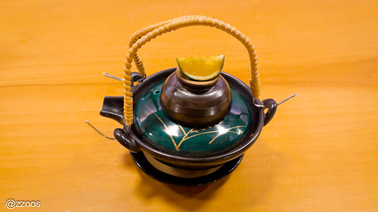 주전자 안에는 수프가 들어 있고요, 작은 잔에 국물을 따라서 마시는 요리입니다. 뚜껑 위에 올려둔 스다치(すだち)를 이용해 산미를 직접 조절하라고 하시네요. 뚜껑을 열어서 안에 있는 내용물도 건져 먹습니다. 주전자 안에는 자연산 송이와 도미살 같은 것들이 들어 있습니다.