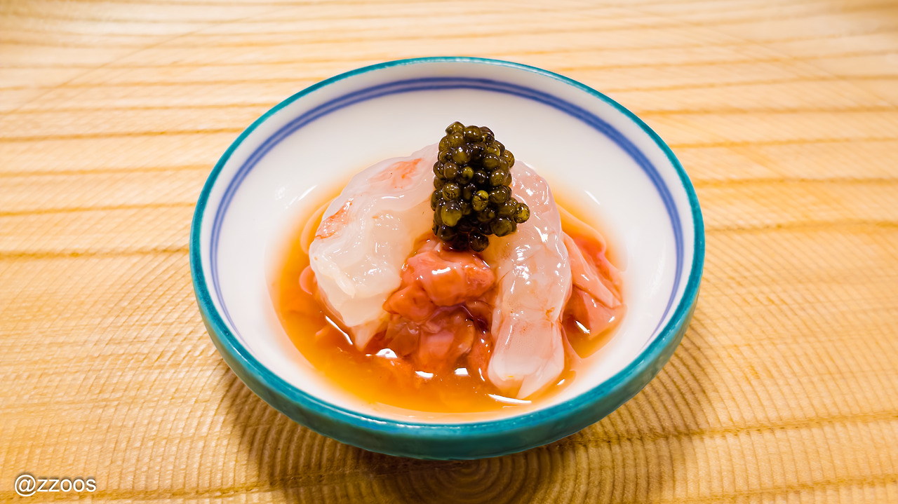 슈토 타카에비 캐비어입니다. 슈토아에(酒盗和え)라고 가다랑어 내장 젓갈 무침을 가끔 안주로 먹곤 하잖아요? 바로 그 슈토(酒盗)입니다. 아주 신선한 가다랑어 내장 젓갈이에요. 사진으로도 그 신선함이 보이죠? 그 위에 타카에비(高エビ)와 캐비어를 올렸습니다.
