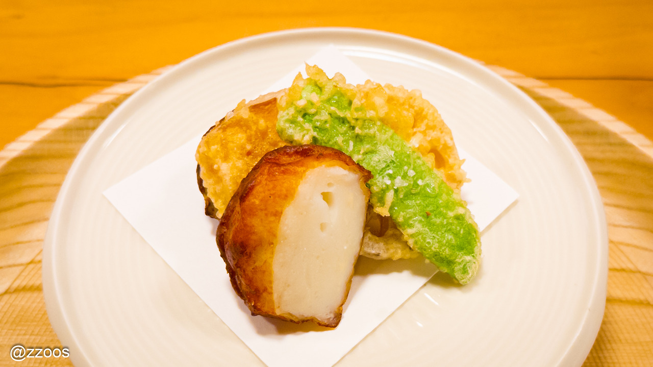 사츠마아게와 야채튀김이 나왔습니다. 플레인 사츠마아게, 렌콘 사츠마아게, 호박, 연근, 콩 껍질